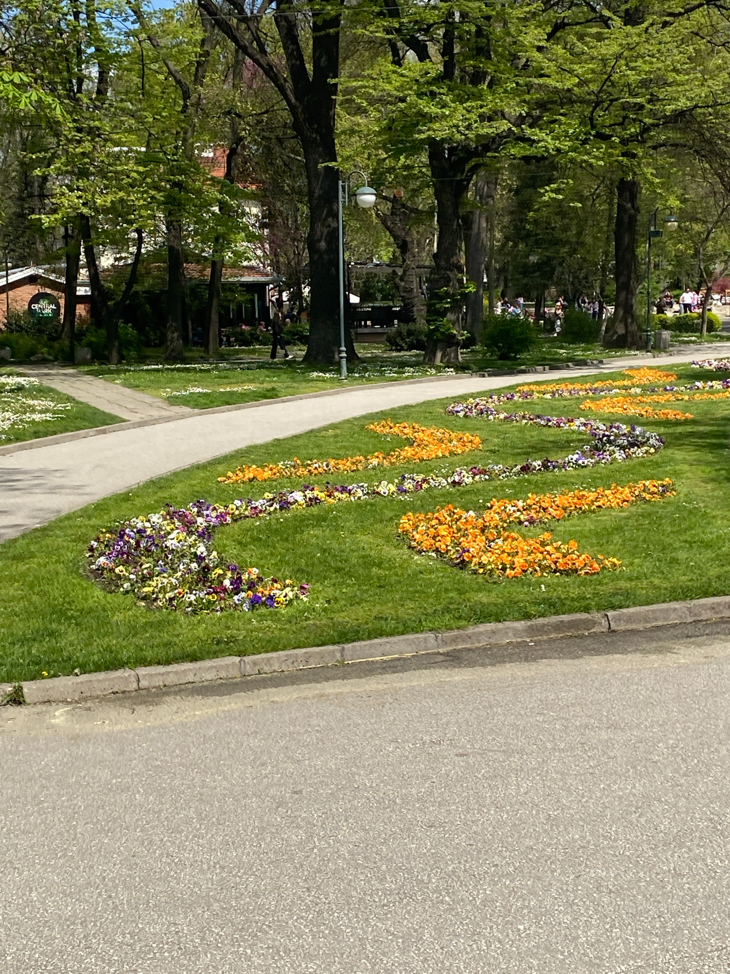 The image captures a park scene in Plovdiv, Bulgaria. A walkway divides a grassy area with flower arrangements from a paved road. The flower beds consist of orange and purple pansies arranged in repea…read more