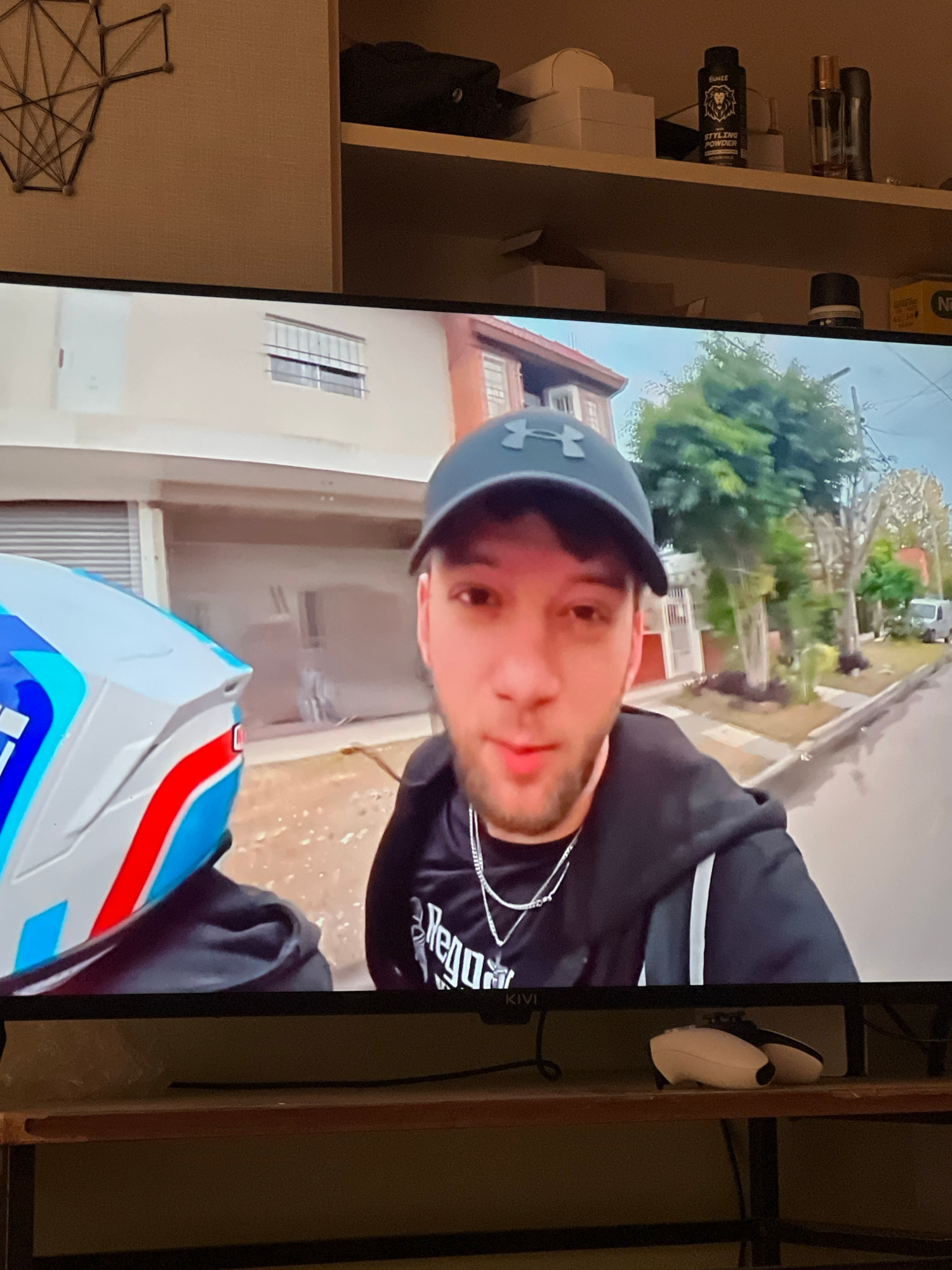 The image shows a television screen displaying a video of a man riding a motorcycle. The man is wearing a black Under Armour baseball cap, a black shirt, and a helmet, which is partially visible. The…read more