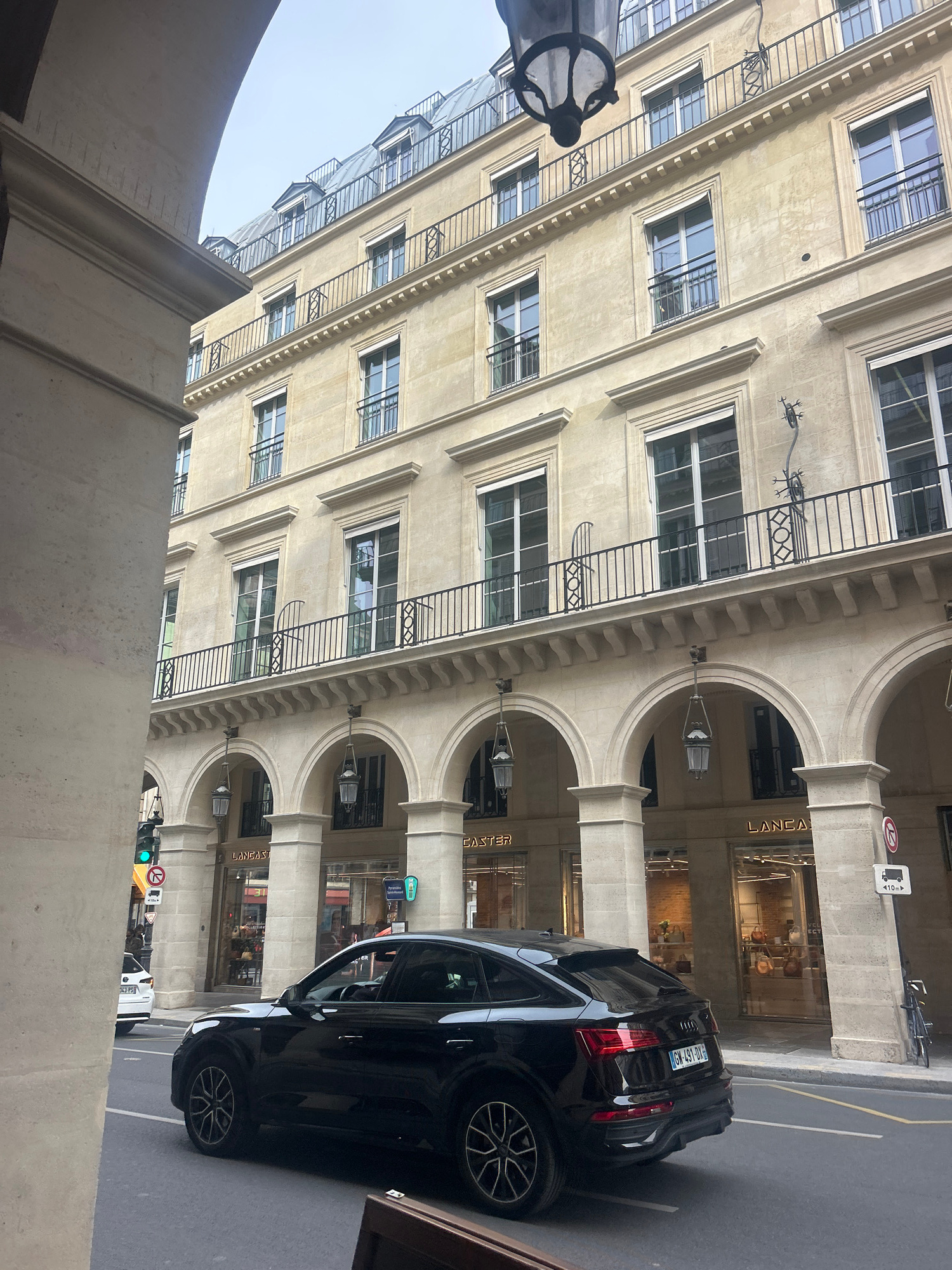 Here is a description of the image: The image depicts a street scene with a light-colored building featuring arched colonnades and black iron railings in Unknown, Unknown. A black car is parked on th…read more