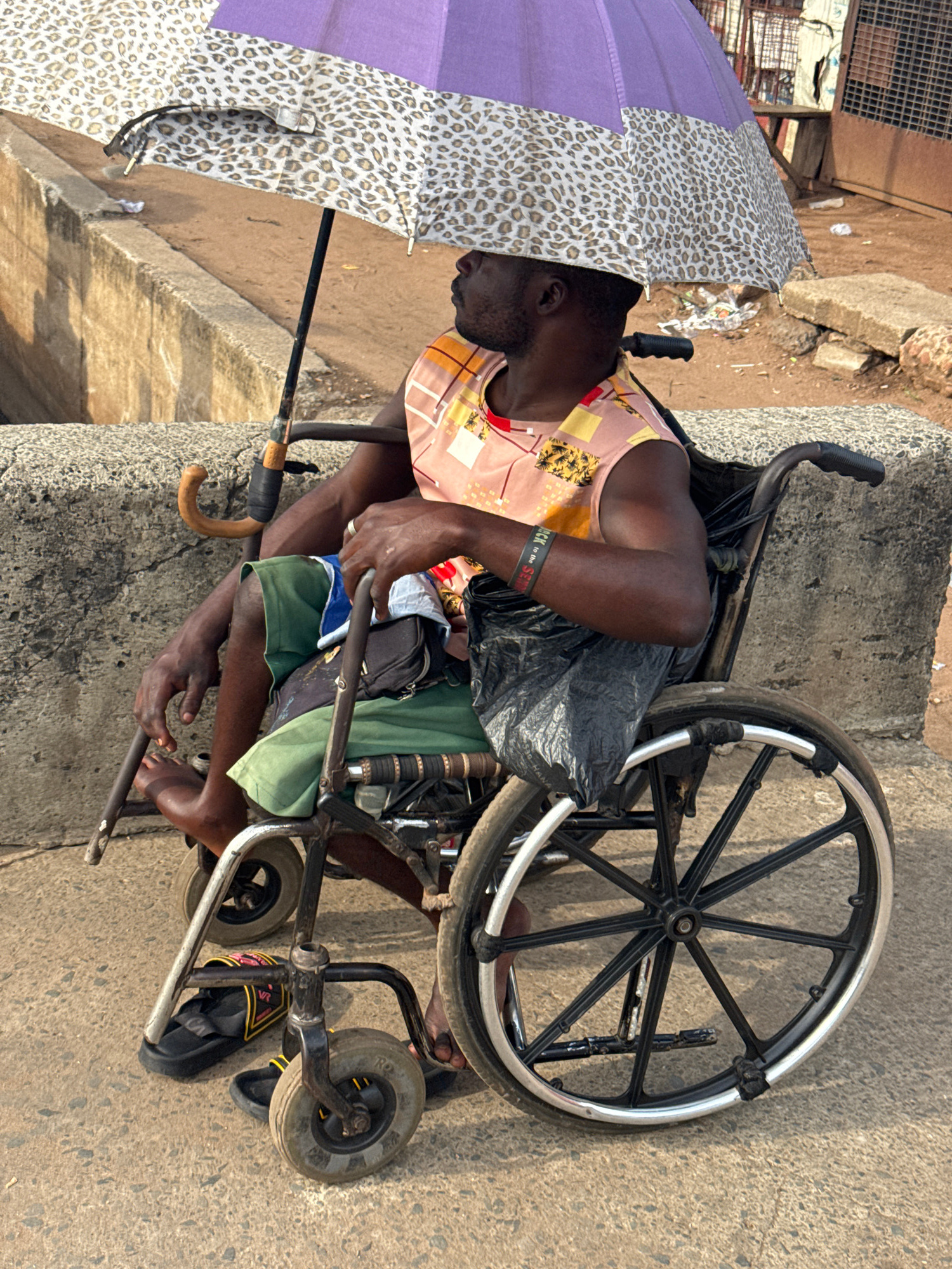 This eye-level, full shot depicts an adult man seated in a manual wheelchair on a sunny outdoor day, likely in Onitsha, Nigeria. The man, with dark skin, is seen in profile looking slightly downwards…read more