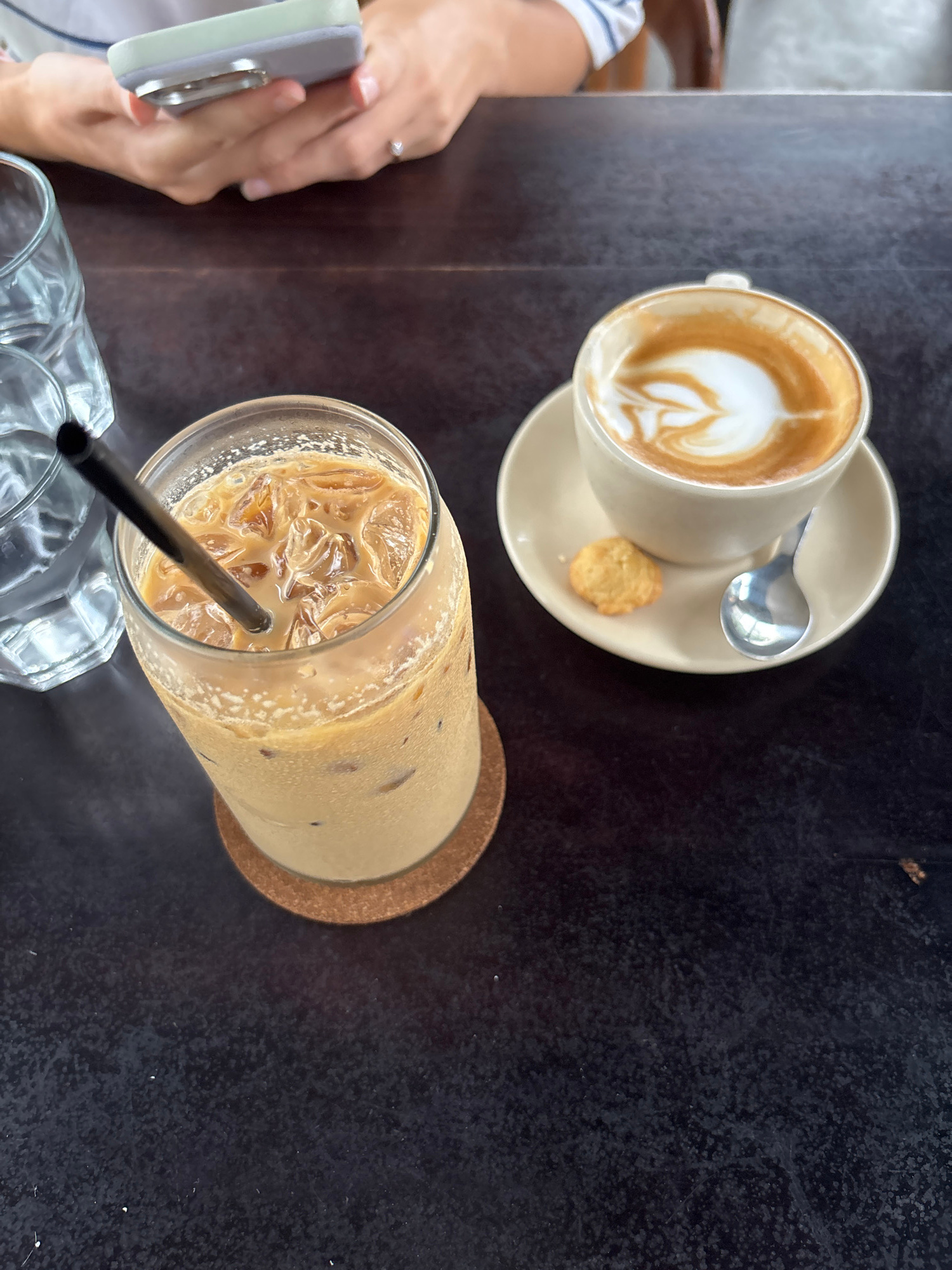 This overhead shot captures a dark, textured table with two coffee beverages and a person's hands. In the upper right quadrant, a light-colored ceramic cup holds a hot coffee featuring intricate latte…read more