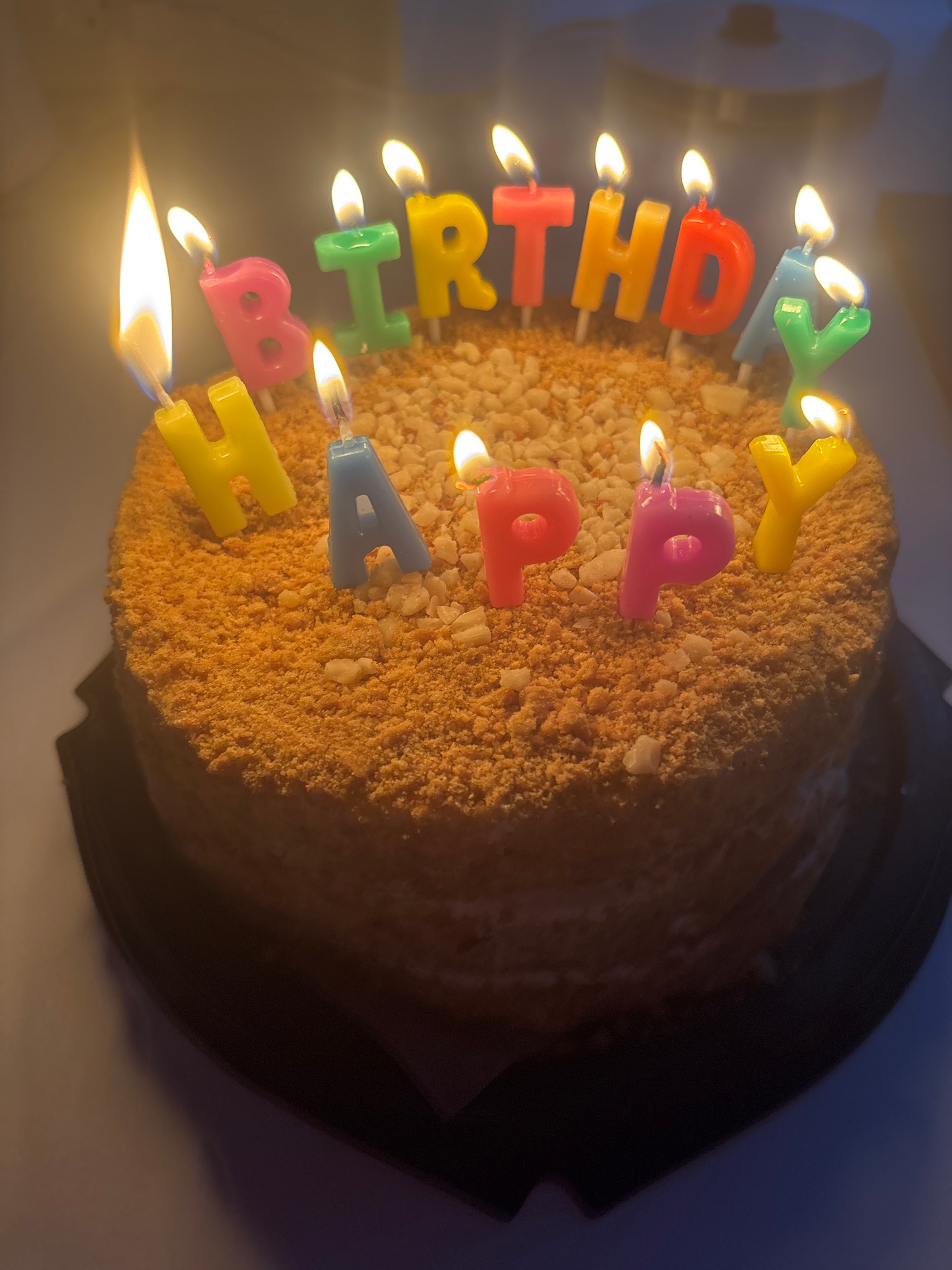 A lit birthday cake is shown from a slightly elevated perspective. The round cake is covered in a tan, crumbly material, possibly cake crumbs or nuts. Letter-shaped candles that spell "HAPPY BIRTHDAY"…read more