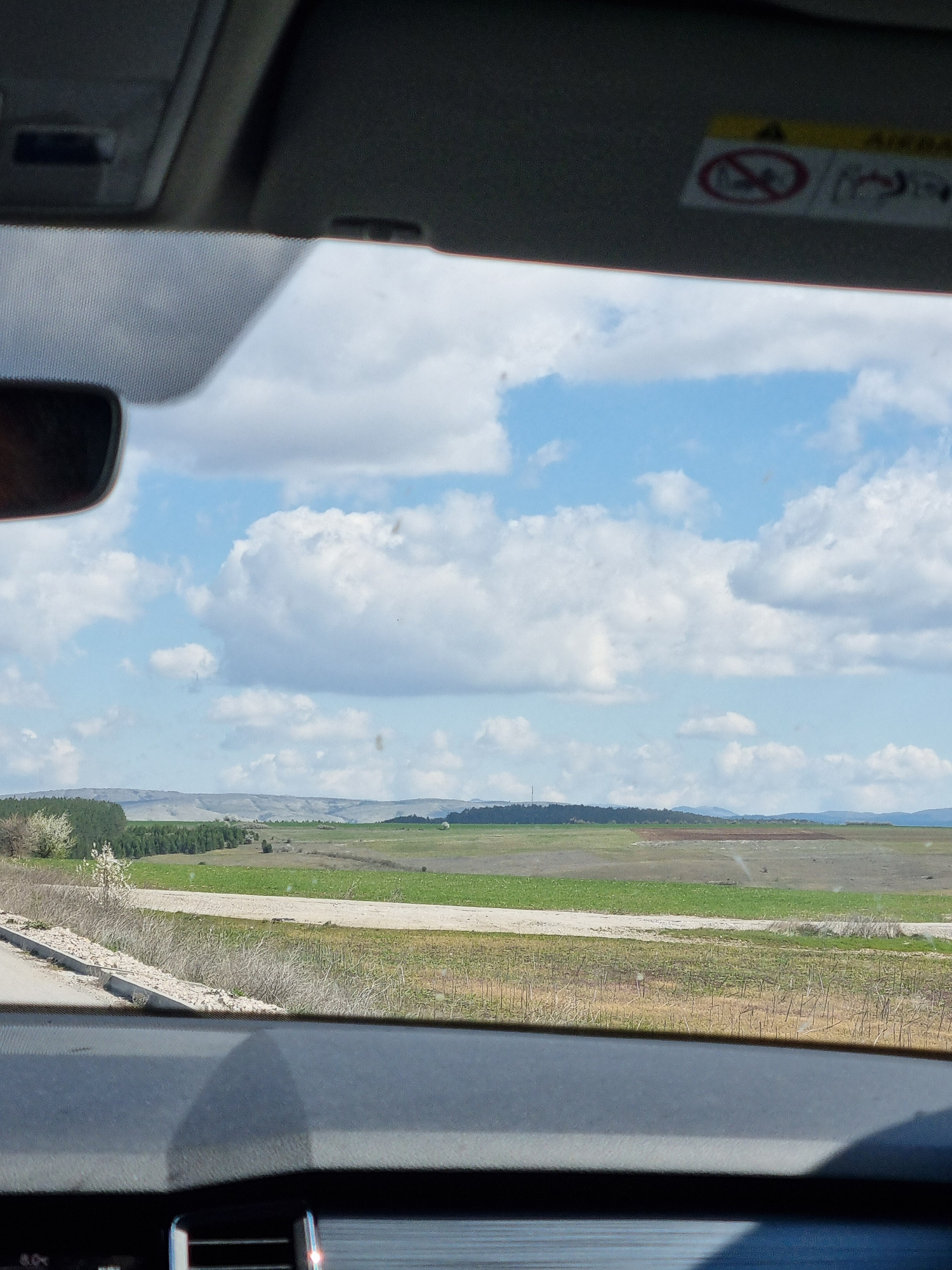 A view from inside a vehicle shows a landscape consisting of a wide field with patches of green and brown, viewed against a sky with white clouds and blue sky. A line of trees runs along the field's e…read more