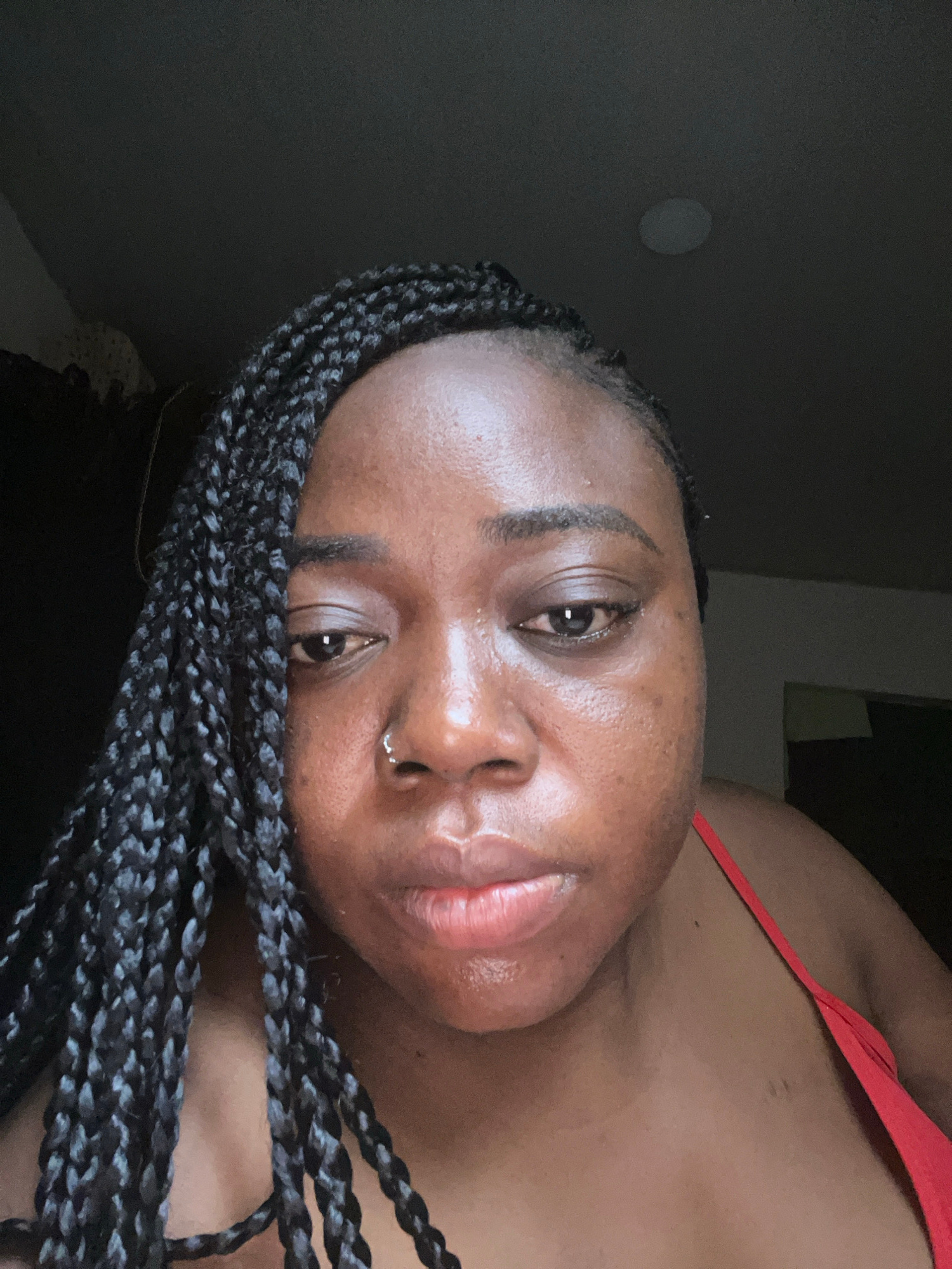 A close-up, tilted portrait of a Black woman with dark braids, potentially indoors with dim lighting. She has a nose piercing. Part of a red strap or garment is visible on her shoulder. The location i…read more