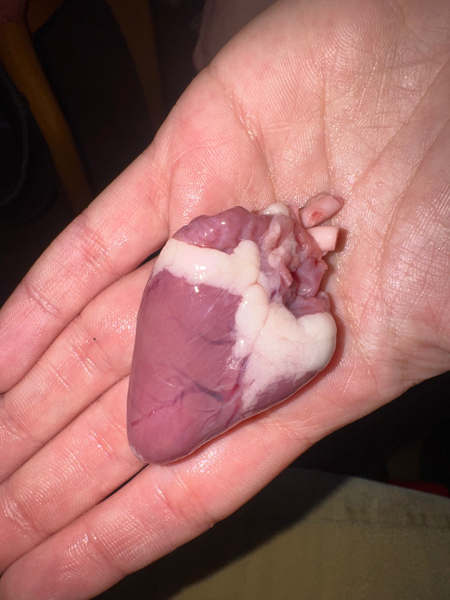 A human hand holds a small, likely animal, heart. The heart is pinkish-purple in color with some white fatty tissue attached. The palm of the hand is pink and shows clear skin texture. The background…read more