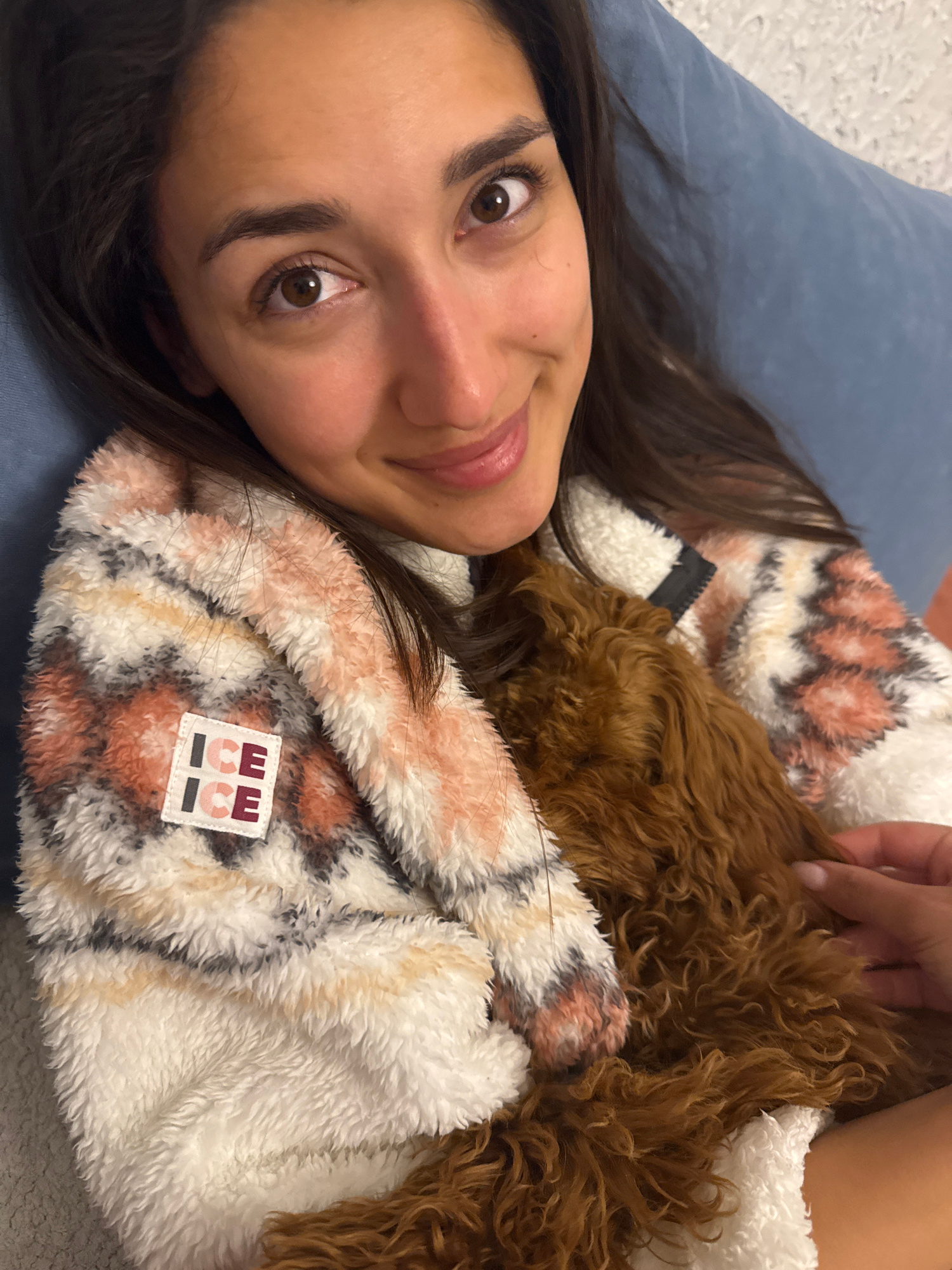 A woman lies on a blue pillow wearing a patterned fuzzy jacket with an "ICE" patch on it. She is facing the camera with a slight smile. A small, brown, curly-haired dog is lying partially on top of he…read more