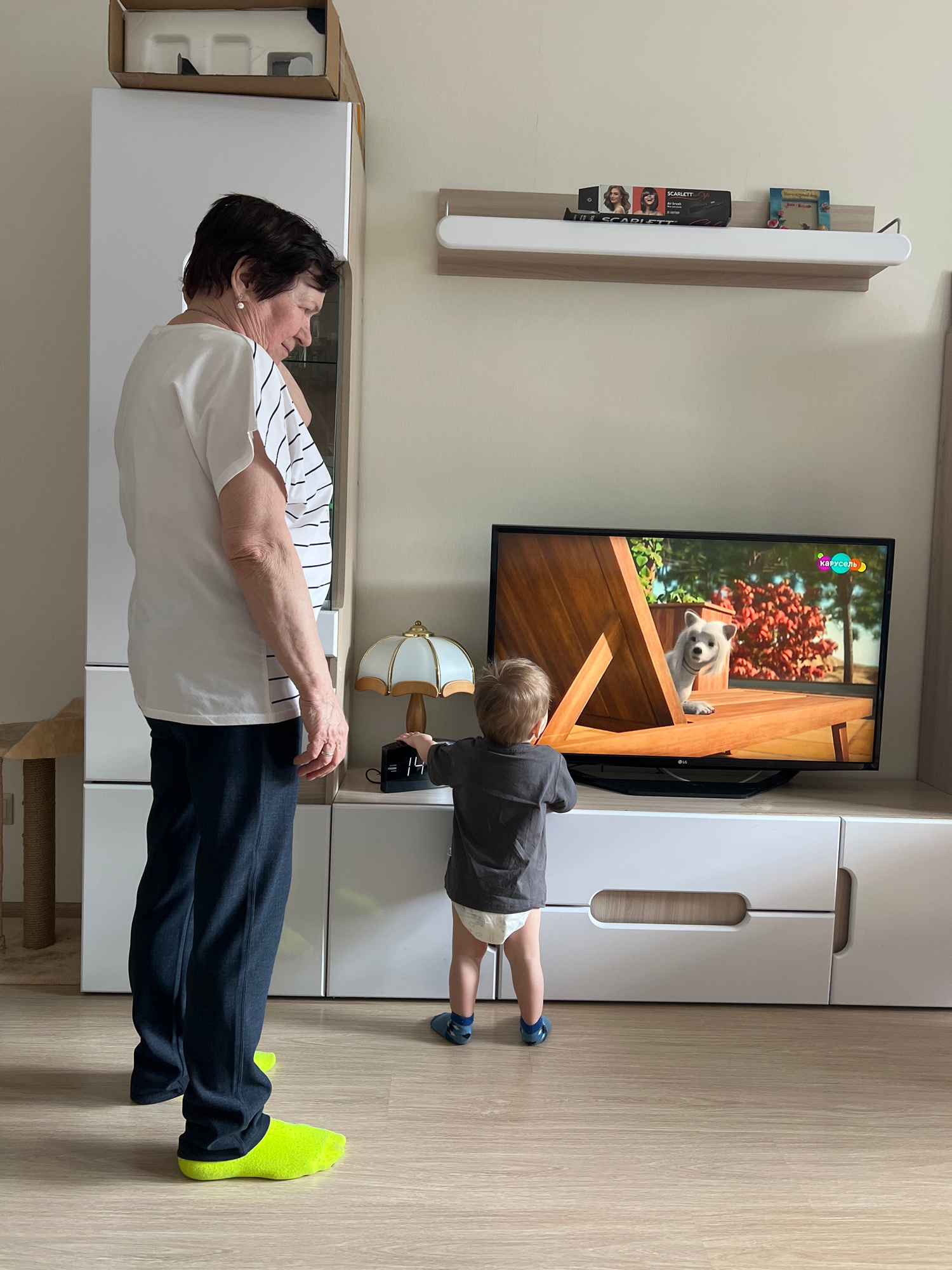 The image captures an indoor scene, likely a living room, featuring an older woman and a young child. The room has light-colored walls and light wood flooring, illuminated by natural or overhead indoo…read more