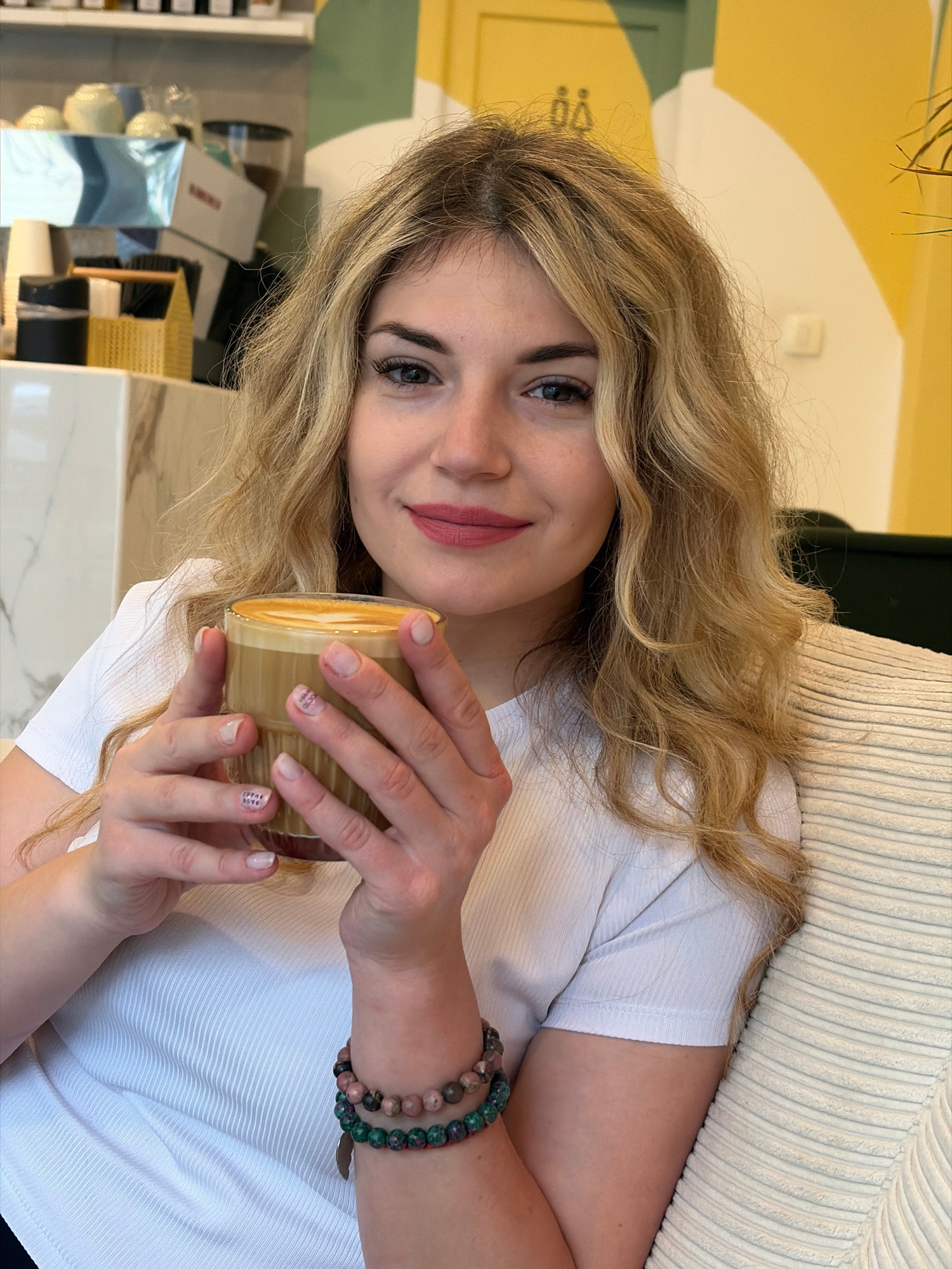 A woman with long blonde hair, wearing a white t-shirt and beaded bracelets, holds a glass of latte. The location may be Budva, Montenegro but it is not evident in this image. The background includes…read more