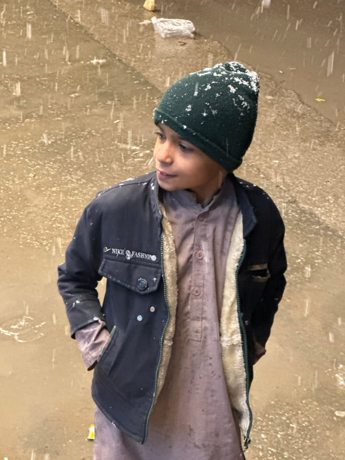 The image captures a young boy from an overhead perspective, standing outdoors during a snowfall. He is dressed for cold weather, wearing a dark green knitted beanie covered in snowflakes, and a black…read more