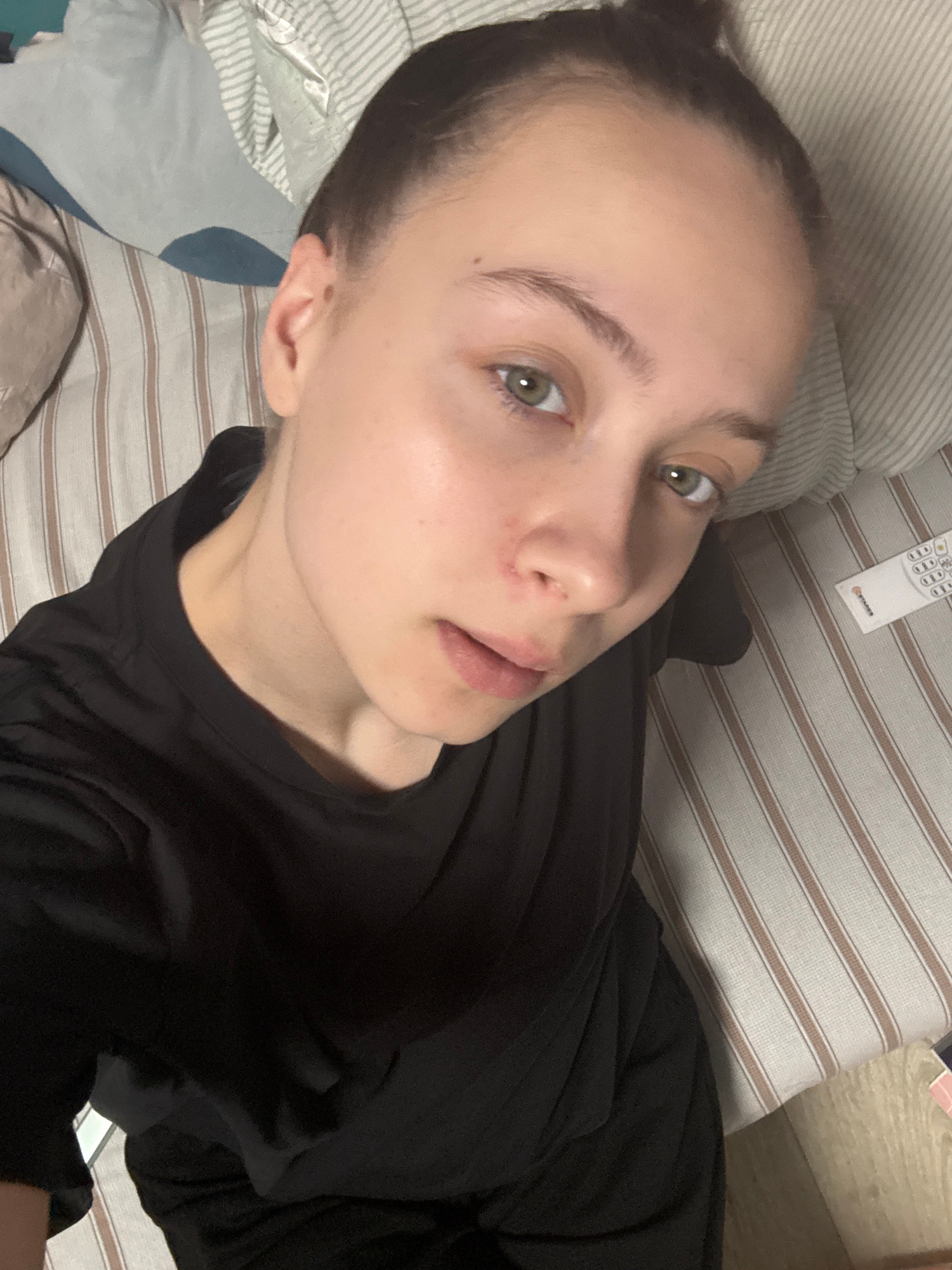A young woman with fair skin, light green eyes, and dark hair pulled back into a bun, lies on a striped bed or sofa. She wears a black t-shirt and is looking upwards at the camera. A remote control is…read more