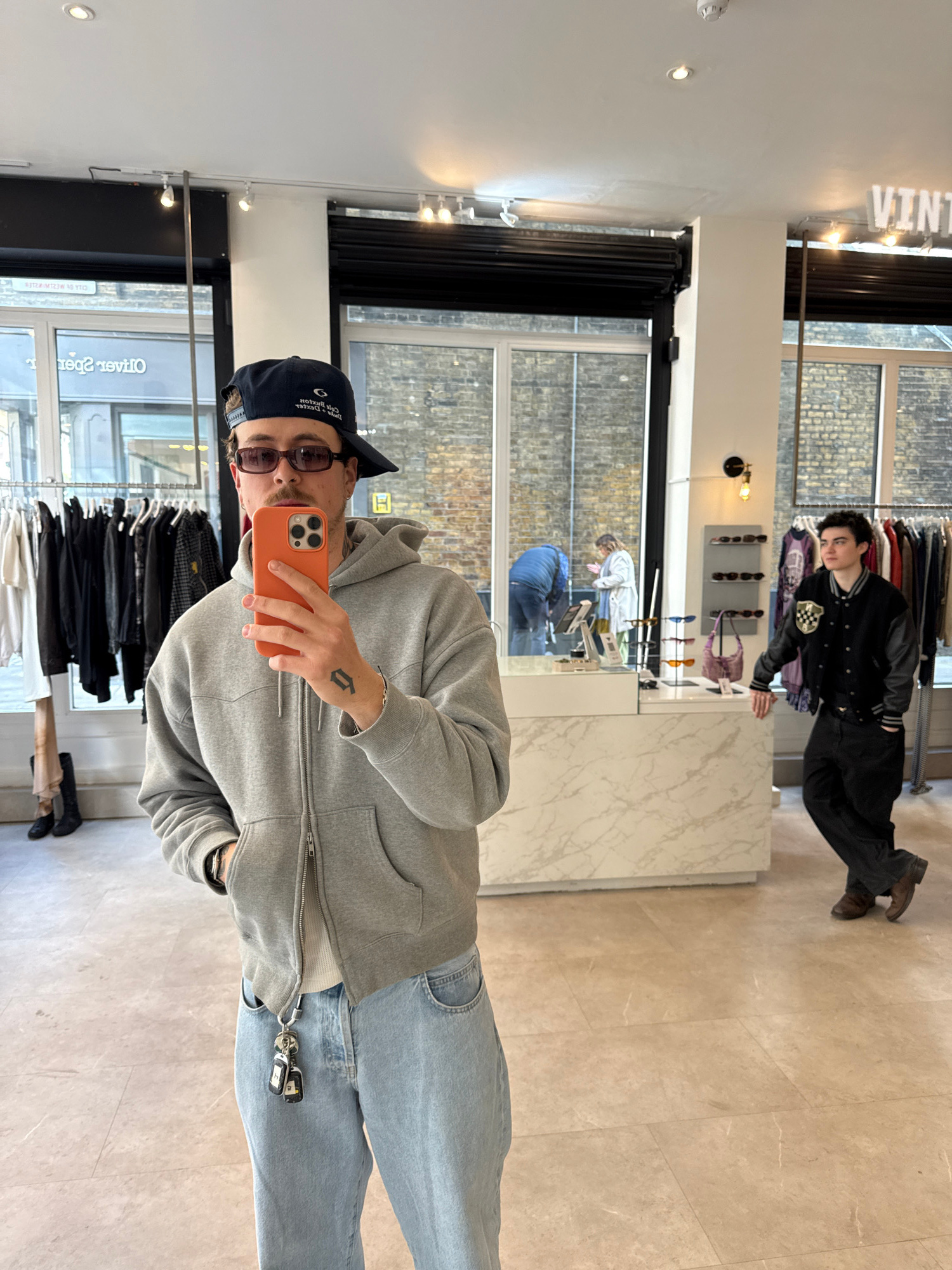 A young man takes a mirror selfie inside a clothing store, which appears to be a vintage or boutique shop. The image, rotated 90 degrees clockwise, captures the man in the foreground holding an orangeβ¦read more