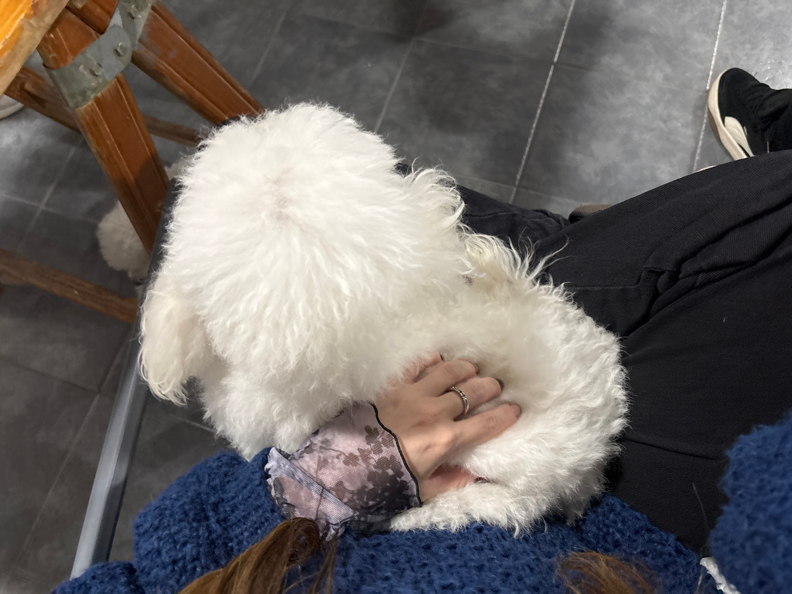 The image captures a top-down view of a person gently interacting with a small, white, fluffy dog resting on their lap. The dog, likely a Bichon Frise or similar breed, is curled up comfortably, its s…read more