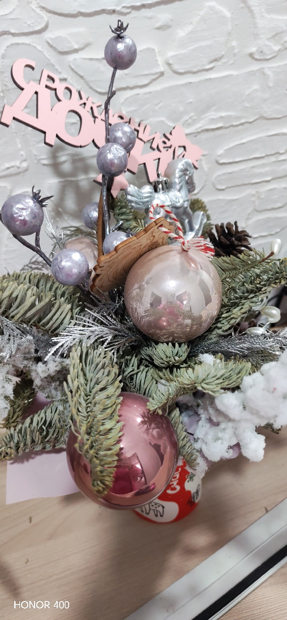 The image depicts a Christmas or New Year's centerpiece arrangement. It contains pine branches (some with faux snow), silver-colored decorative twigs with spherical ornaments, two pink/rose-colored Ch…read more
