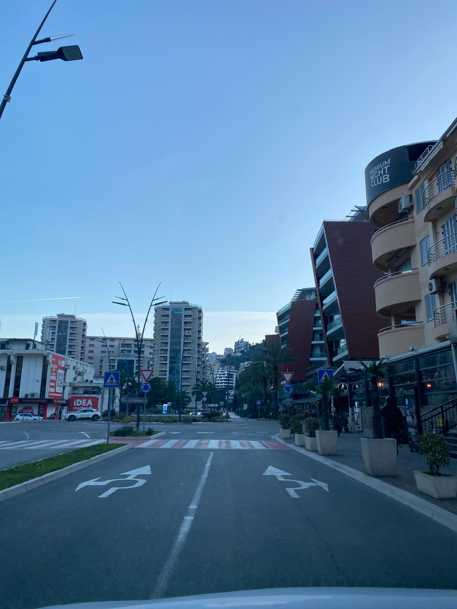 The image depicts a street scene in Budva, Montenegro. The camera is angled upward, capturing buildings, street signs, and the sky. Several buildings are visible along the street, including a structur…read more