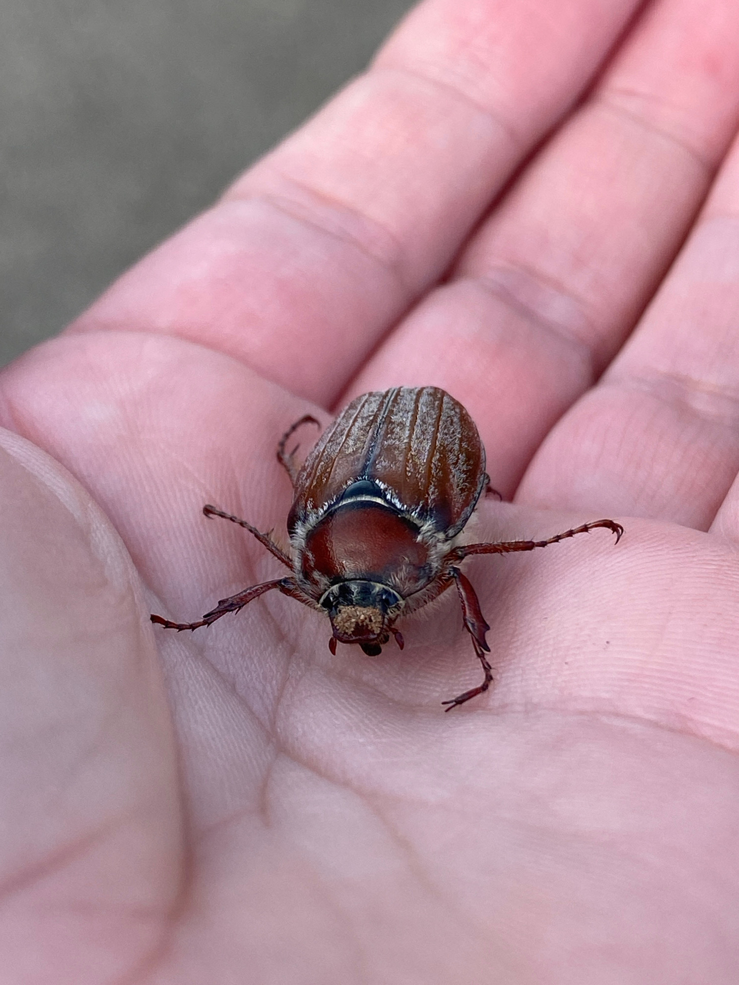 An overhead close-up shot captures a large, reddish-brown beetle resting on the open palm of a human hand. The hand, with its visible skin texture and faint lines, serves as the primary surface for th…read more