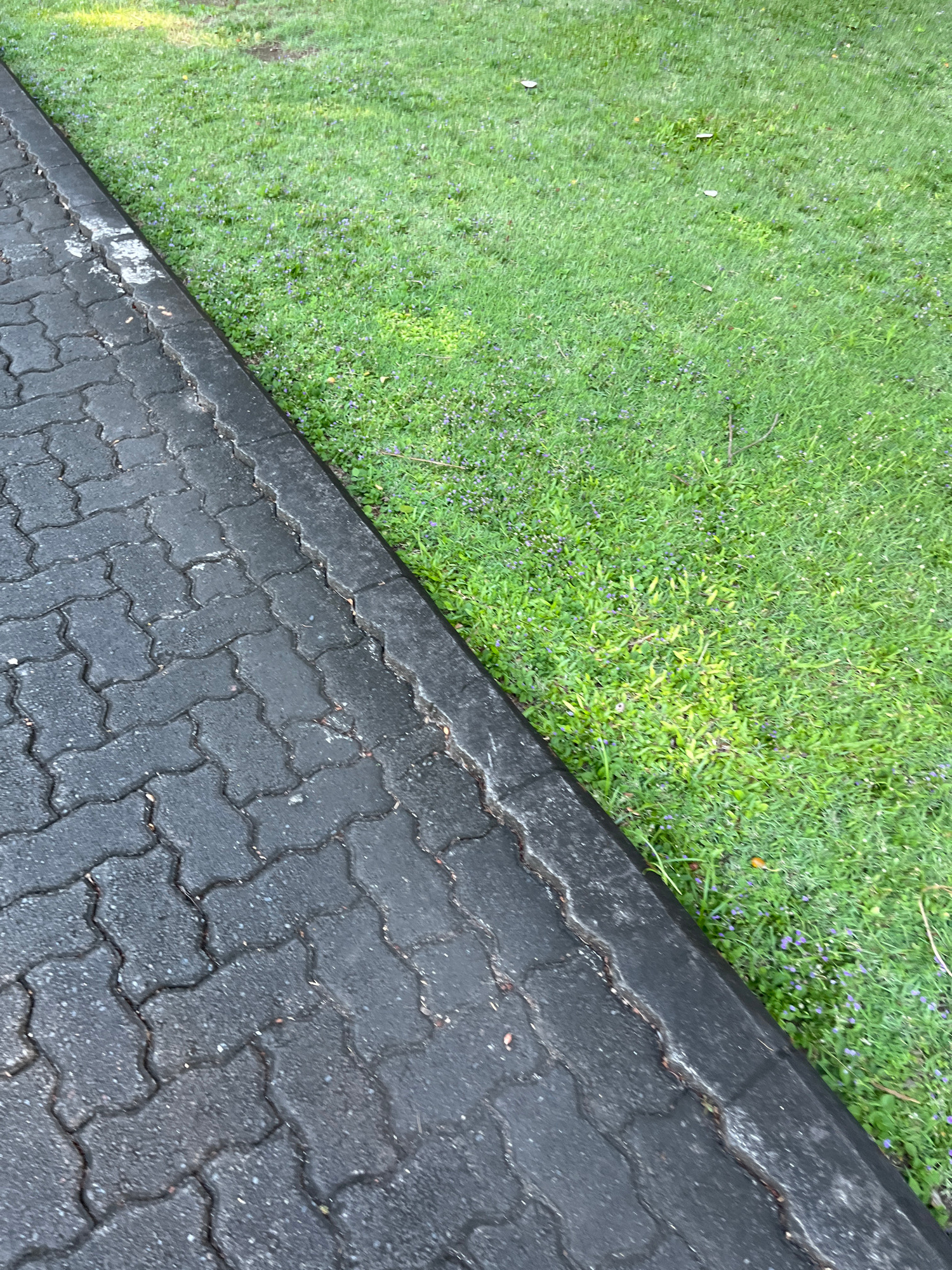The image shows a close-up view of a section where green grass meets a paved area. The paved area appears to be constructed from interlocking blocks and is dark gray in color. The grass is green and d…read more