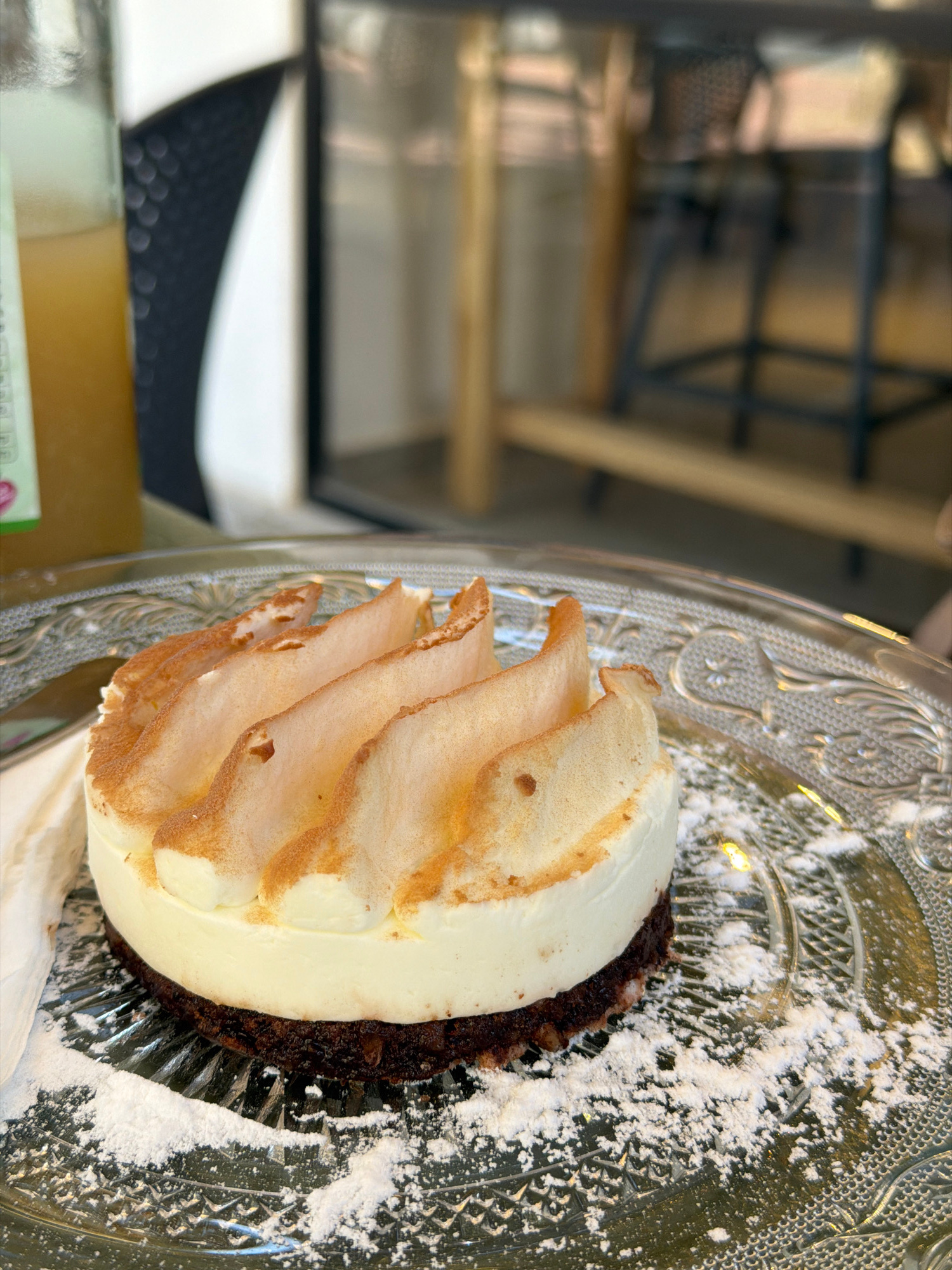 A dessert is presented on an ornate glass plate, dusted with powdered sugar. The dessert consists of a dark base, topped with a white creamy layer, and decorated with thin, toasted elements. The plateβ¦read more