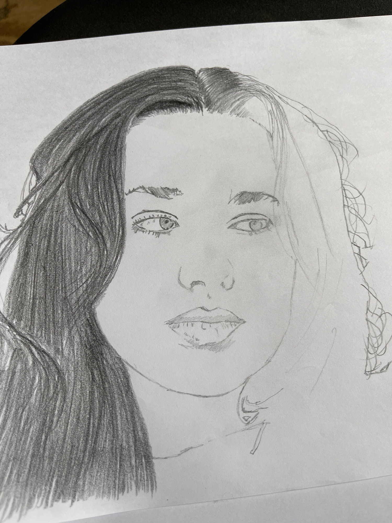 A pencil drawing on white paper shows a woman's face. The top portion of her face has lighter sketching, while the lower portion of her hair is heavily shaded. The drawing is not in Jos, Nigeria, and…read more