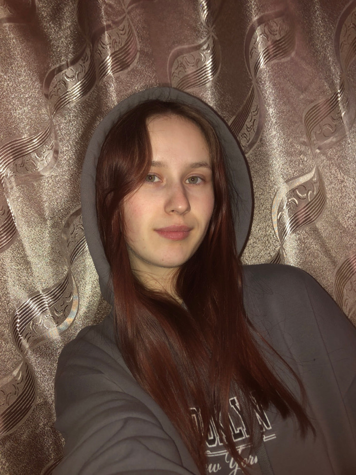 A single female individual is centrally depicted in a medium close-up, looking directly forward. She has long, reddish-brown hair, light-colored eyes, and fair skin, exhibiting a neutral expression wi…read more