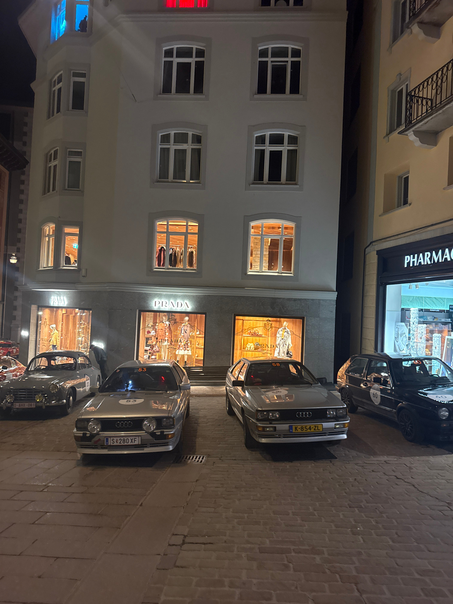 This nighttime image depicts a street in Sankt Moritz, Switzerland, showcasing vintage rally vehicles parked on a wet cobblestone surface in front of illuminated buildings. The central structure is a…read more