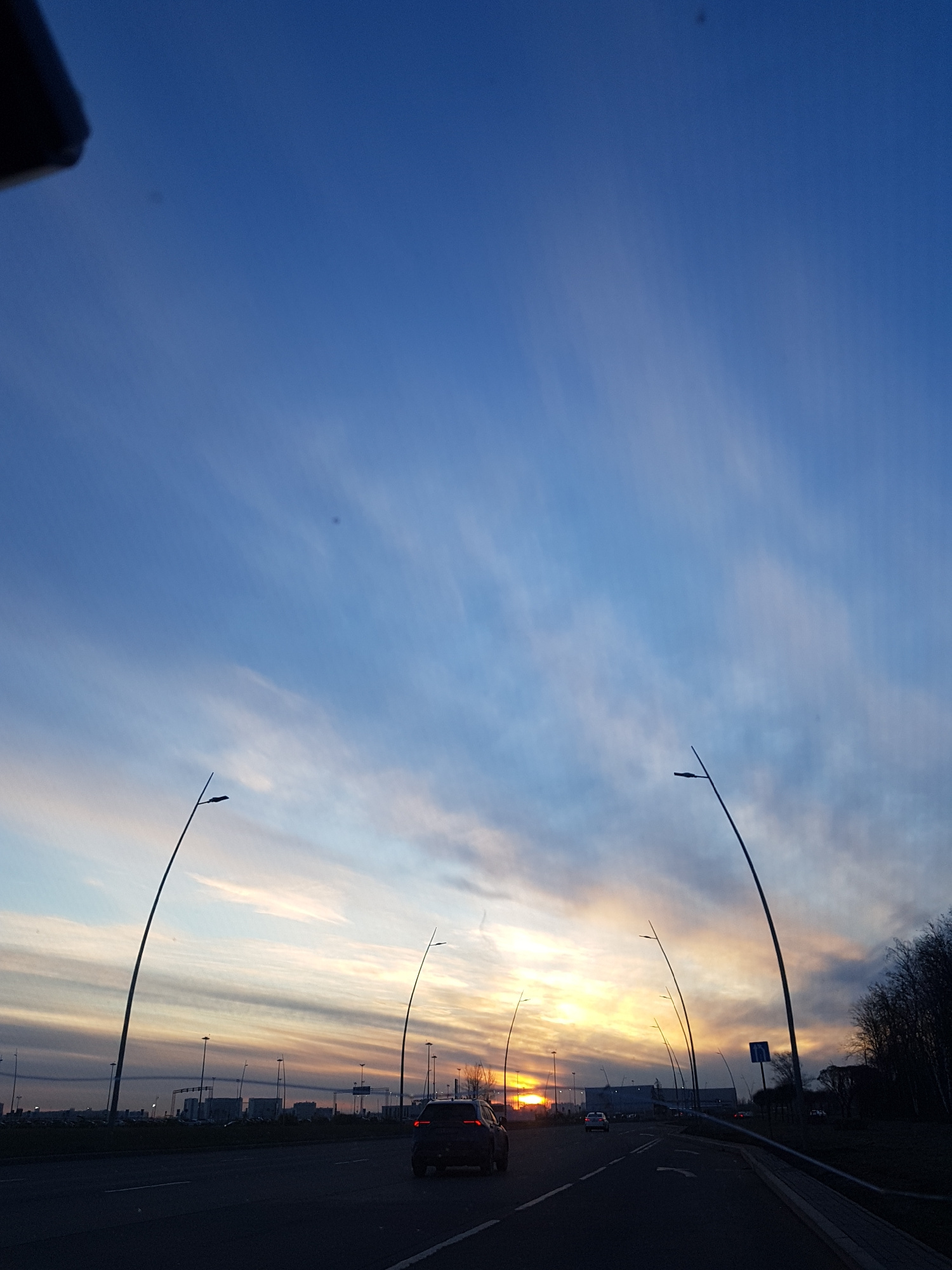 The image shows a road, likely a highway, in the city of Saint Petersburg, Russia, during what appears to be either sunrise or sunset. A vehicle with illuminated taillights is on the road. Several lamβ¦read more
