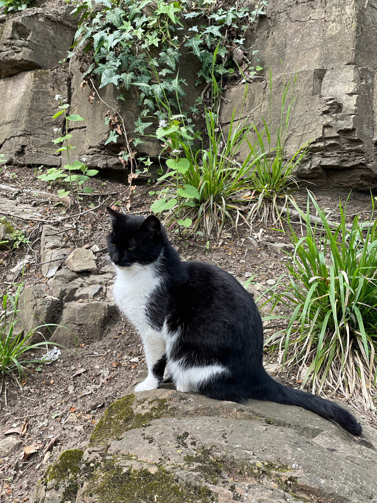 A black and white tuxedo cat is positioned on a rocky, uneven ground surface, looking downwards and slightly to the left. The cat has black fur on its back, head, and tail, with distinct white marking…read more