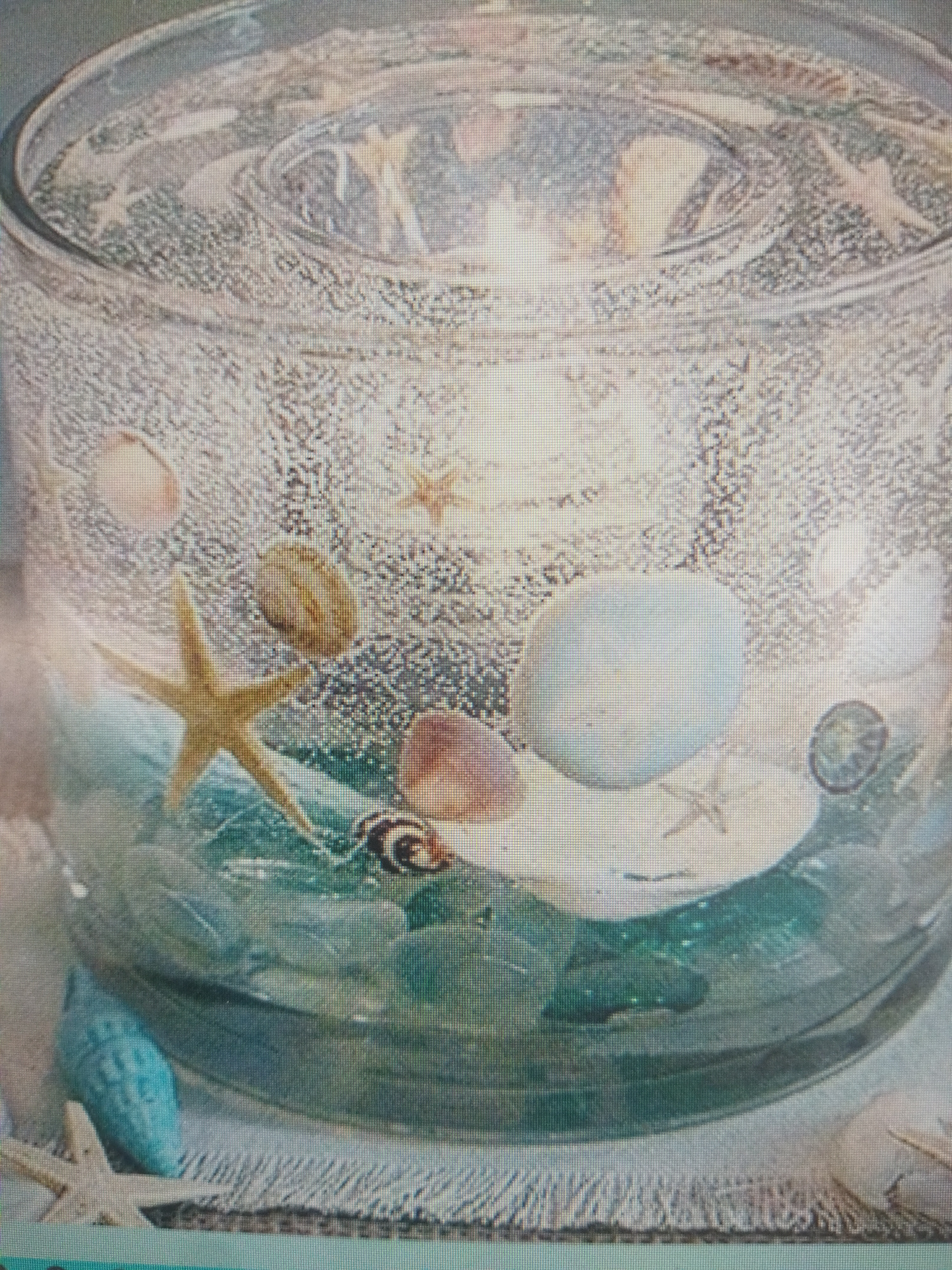 The image depicts a clear glass container filled with various beach-themed decorations. The bottom layer consists of turquoise-colored glass stones. Above the stones are several seashells, including a…read more