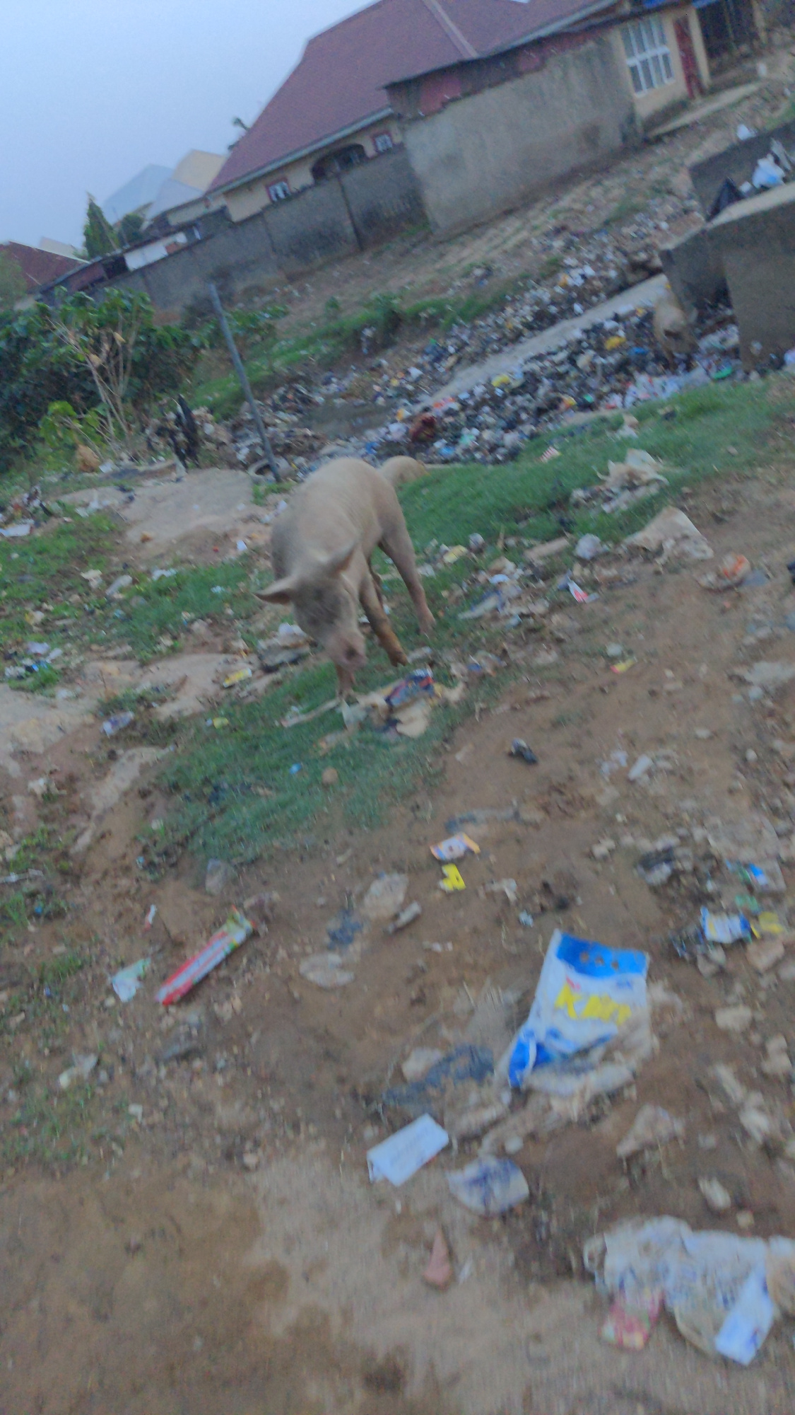 A light-colored cow stands near a drainage ditch filled with trash in Ado, Nigeria. Buildings are in the background. The ground is littered with debris.
