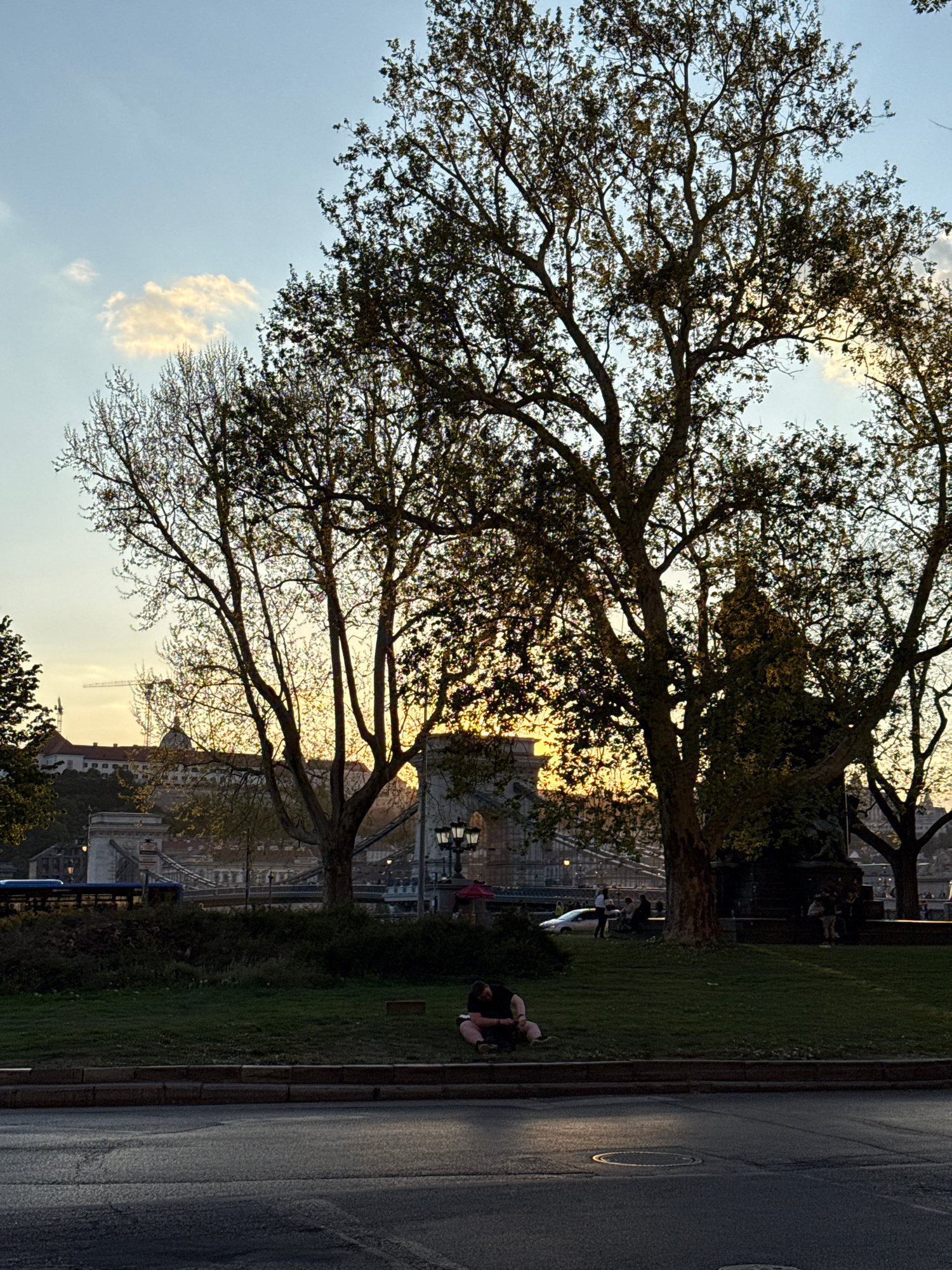 The image depicts a scene in Budapest, Hungary, likely along the Danube River. A large tree with partially bare branches dominates the left side of the frame, its branches extending across the sky. Th…read more