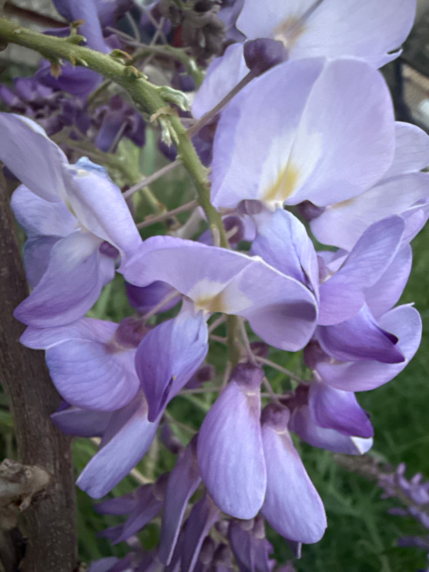 Close-up of a cluster of light purple wisteria flowers with a yellow tinge, likely in Alanya, Turkey. The flowers are at different stages of bloom, with some appearing as closed buds. A green stem is…read more