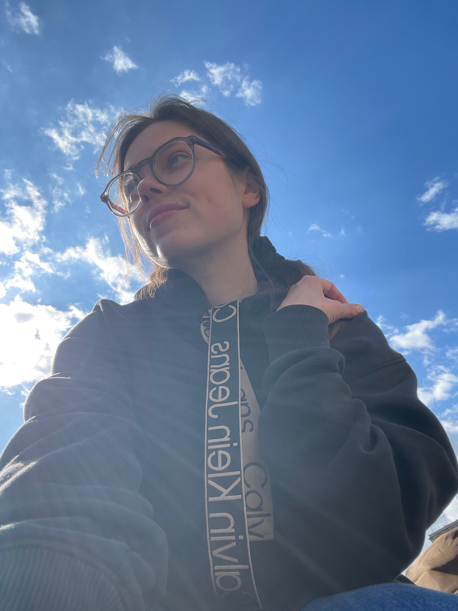 A low-angle outdoor portrait depicts a young adult female, approximately 20-30 years old, under a bright blue sky dotted with scattered white cumulus clouds. The scene is located in Naples, Italy. The…read more