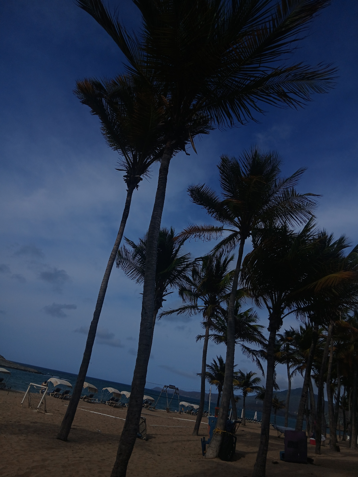 The image shows a row of palm trees on a beach in Altagracia, Venezuela. The sky is a deep blue, likely dusk or dawn. Beach umbrellas and chairs are visible on the sand. The sea is calm and a dark col…read more