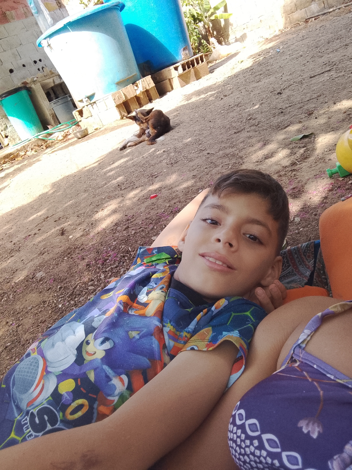A young adolescent boy is lying down, appearing to rest his head on the lap or chest of an unseen individual. He is wearing a blue shirt with Sonic the Hedgehog characters. The unseen person is wearinβ¦read more