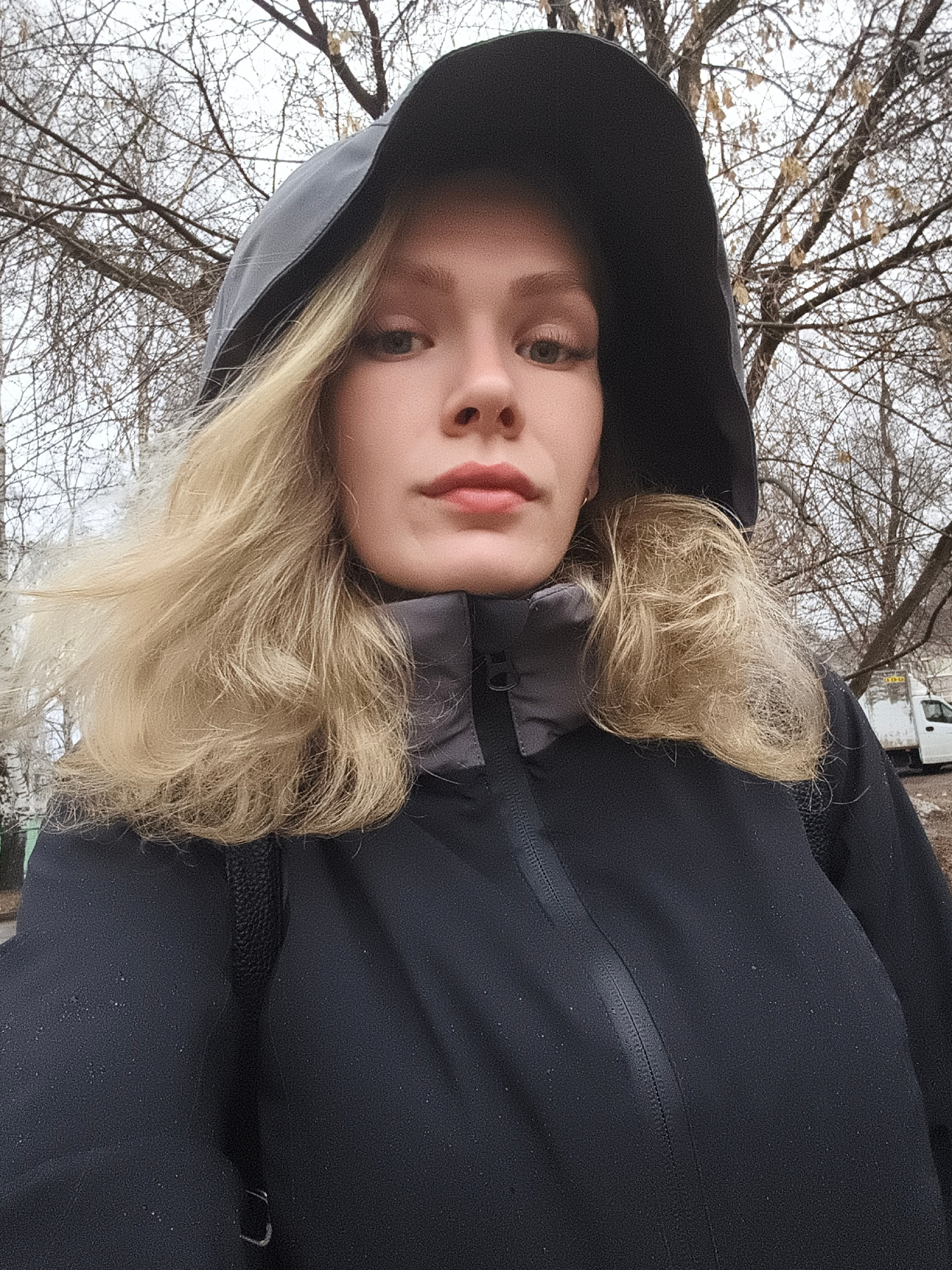 A woman with light blonde hair and fair skin is the focal point of a medium-shot selfie. She is wearing a dark-colored jacket with a hood pulled up, obscuring her hairline and the top of her head. The…read more