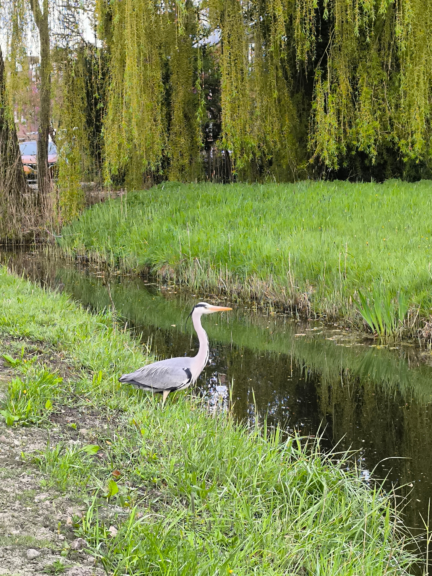 A grey heron stands in the grass at the edge of a narrow, dark stream. The stream is bordered by tall grass on both sides. A weeping willow tree with long, light green branches hangs over the stream i…read more