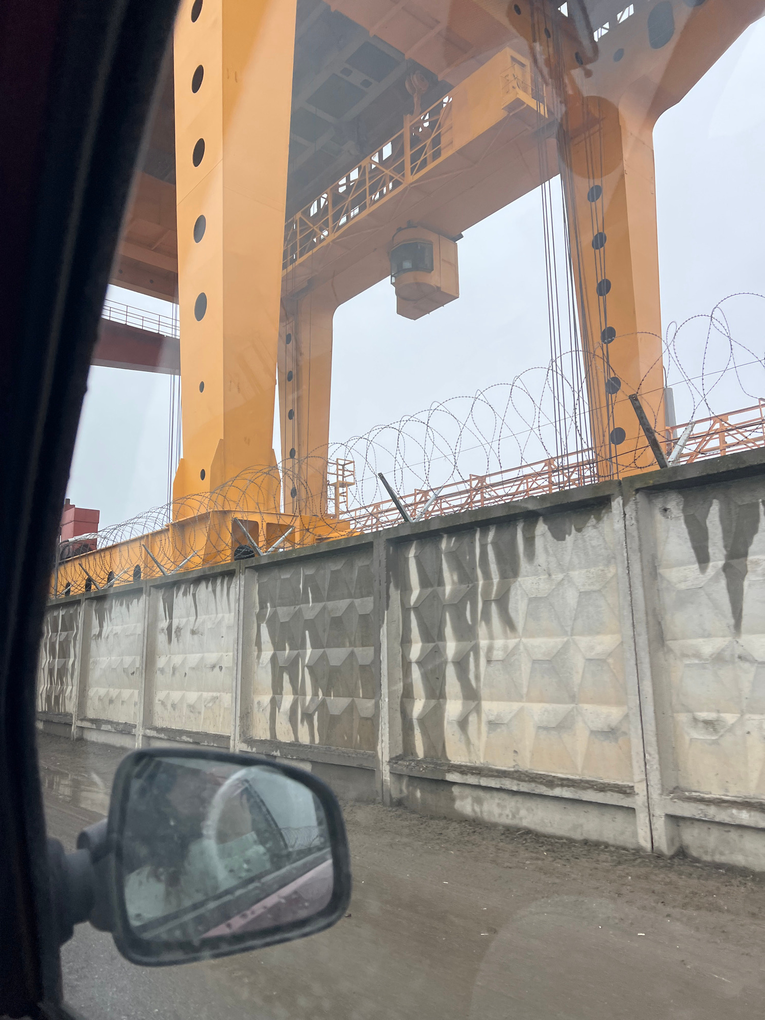 The image, taken from inside a vehicle, shows an industrial scene. A large yellow crane structure dominates the left side of the frame, while a concrete wall runs along the right side. Barbed wire is…read more