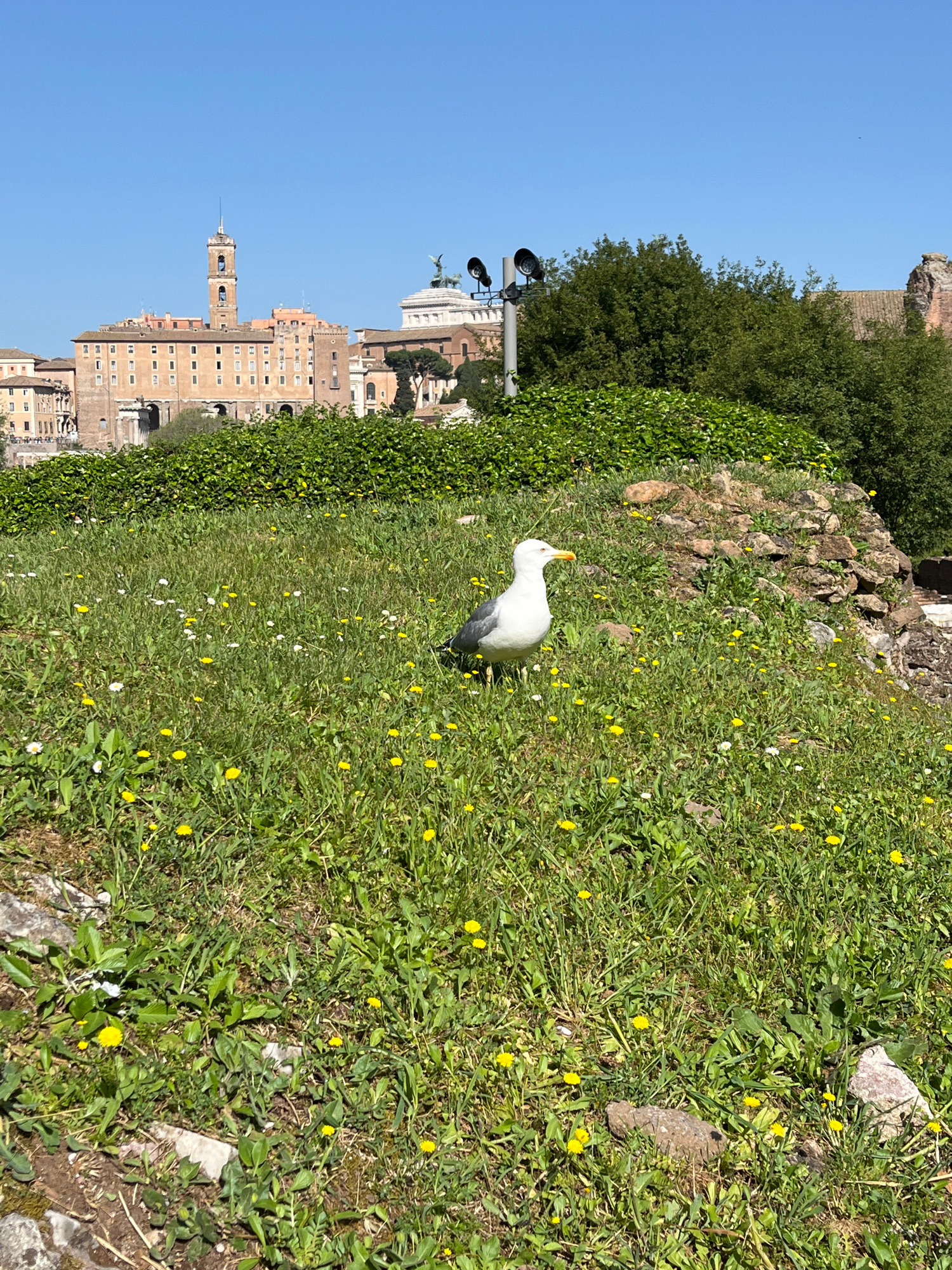 The image captures an outdoor scene, likely in Rome, Italy, showcasing a blend of nature and historic architecture on a clear, sunny day. In the foreground, a prominent white seagull with grey wings…read more