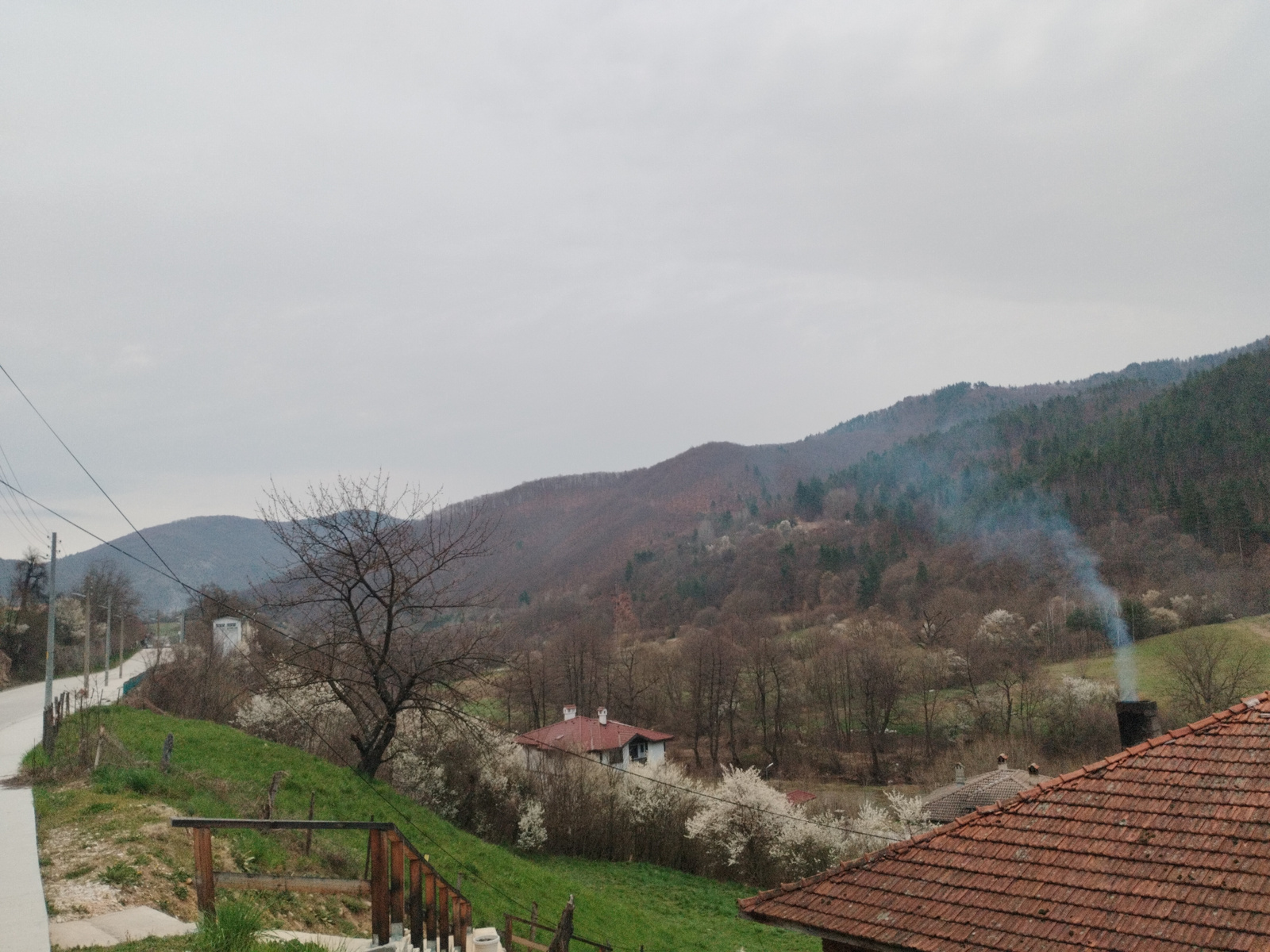 The image shows a rural scene in Smilyan, Bulgaria on an overcast day. A road curves into the distance on the left, bordered by a green grassy area and utility poles. A bare tree stands prominently inβ¦read more