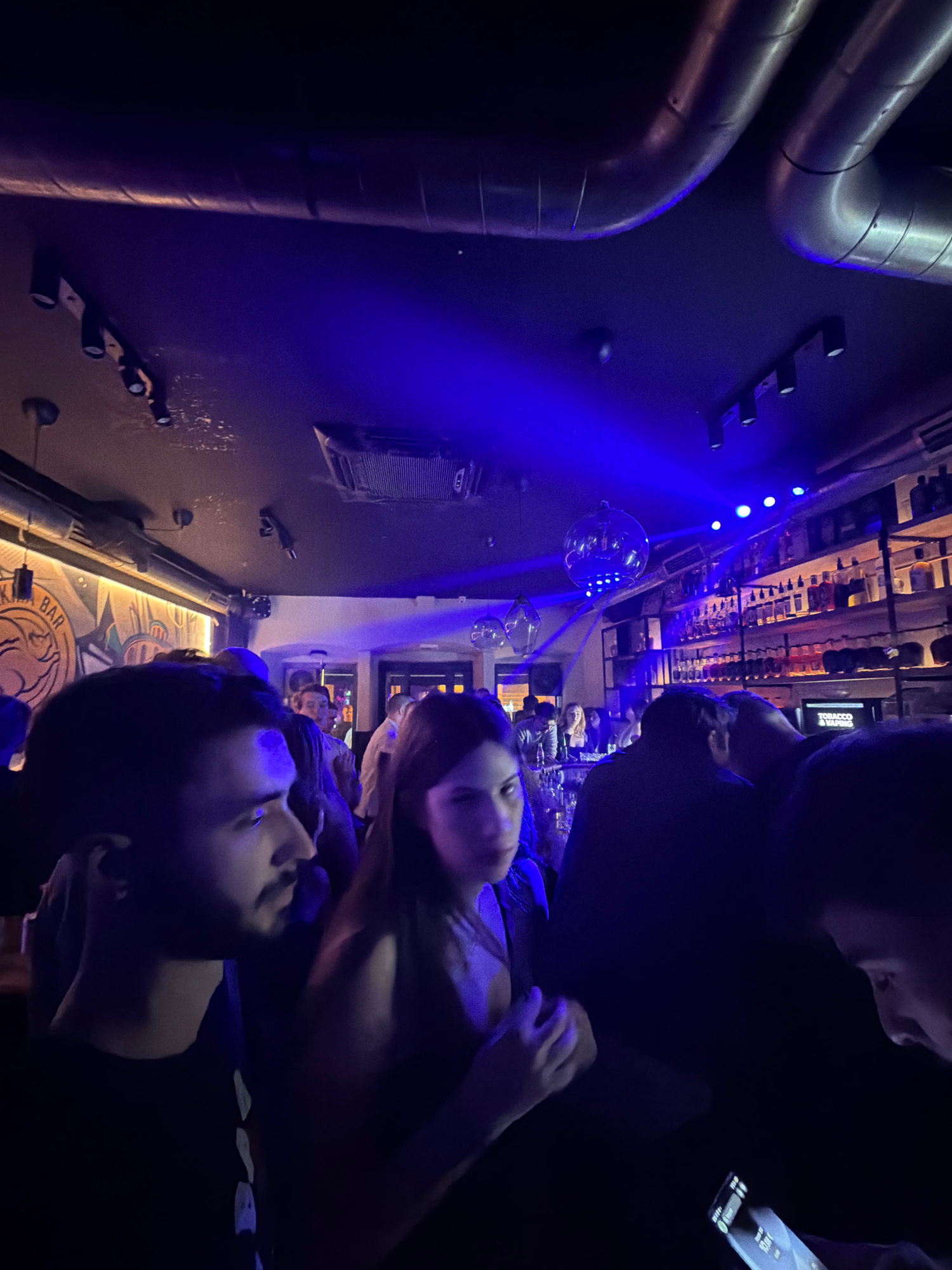 The image appears to be taken inside a bar, possibly in Grad Rijeka, Croatia, although this cannot be confirmed solely from the image. The scene is dimly lit with blue lighting. Several people are pre…read more
