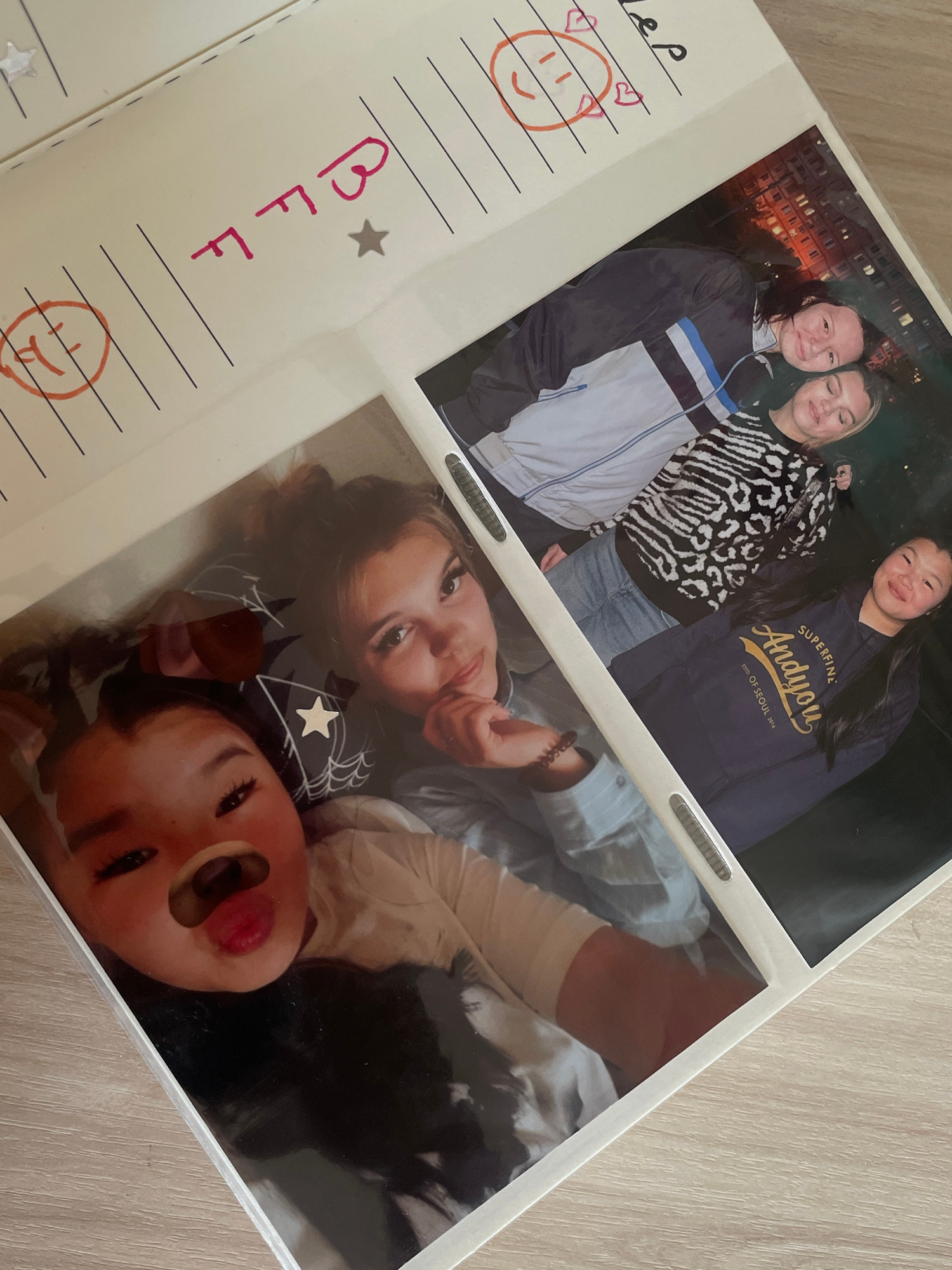 The image shows an open photo album resting on a light-colored wooden surface. The album displays two photographs and handwritten notes on the left page. The top photograph captures three young women…read more