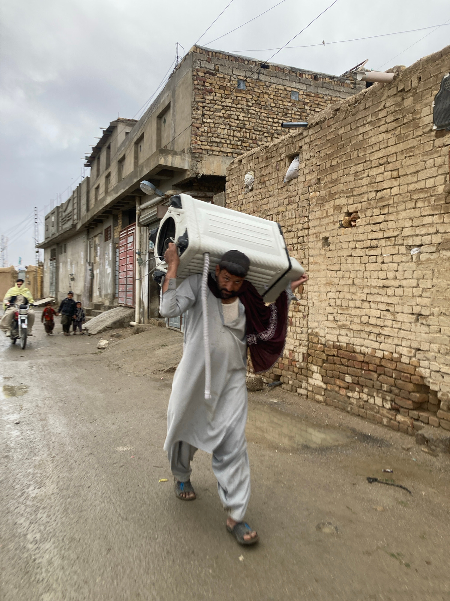 The image shows two men carrying a white appliance, likely a washing machine, through a narrow alley in what appears to be a densely populated area of Quetta City Tehsil, Pakistan. The alley is flankeβ¦read more