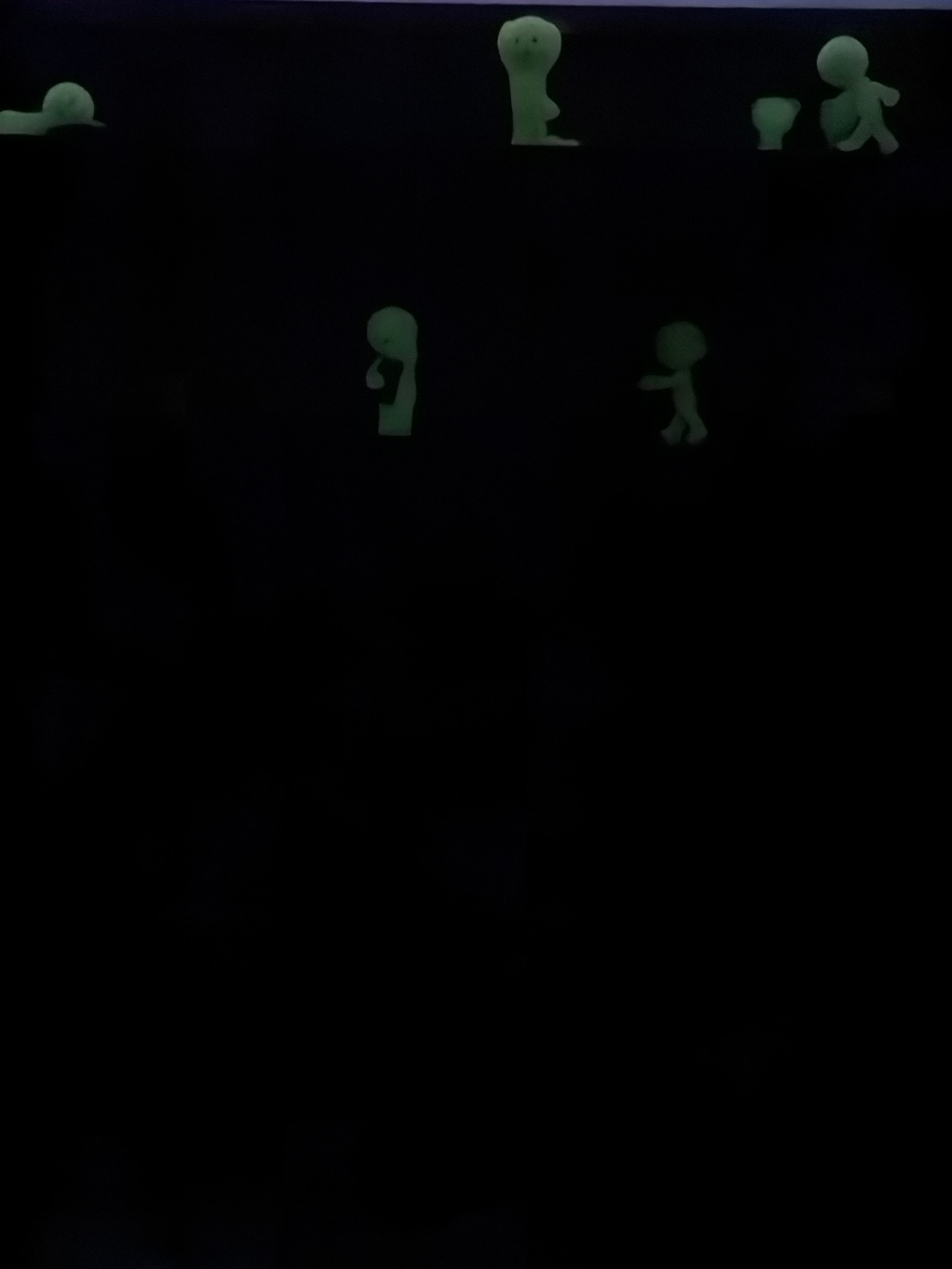 The image shows several small, vaguely humanoid figures that appear to be glowing or luminescent. They are scattered on a dark, undefined surface, possibly a wall or board. Their forms are simple and…read more