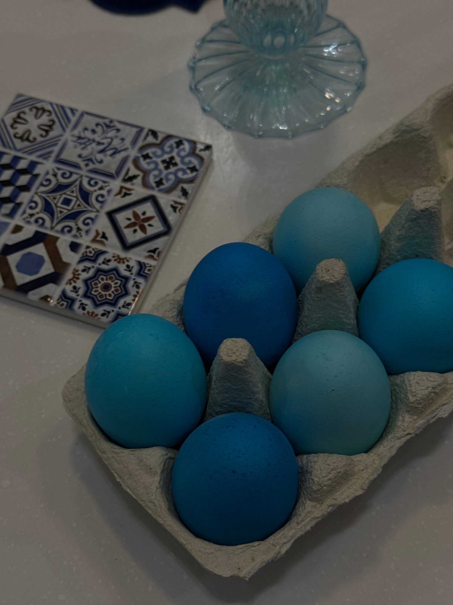 The image depicts a still life arrangement on a white surface. A cardboard egg carton contains six blue-colored eggs. A small, blue-tinted glass vase is positioned to the left of the carton. A square…read more