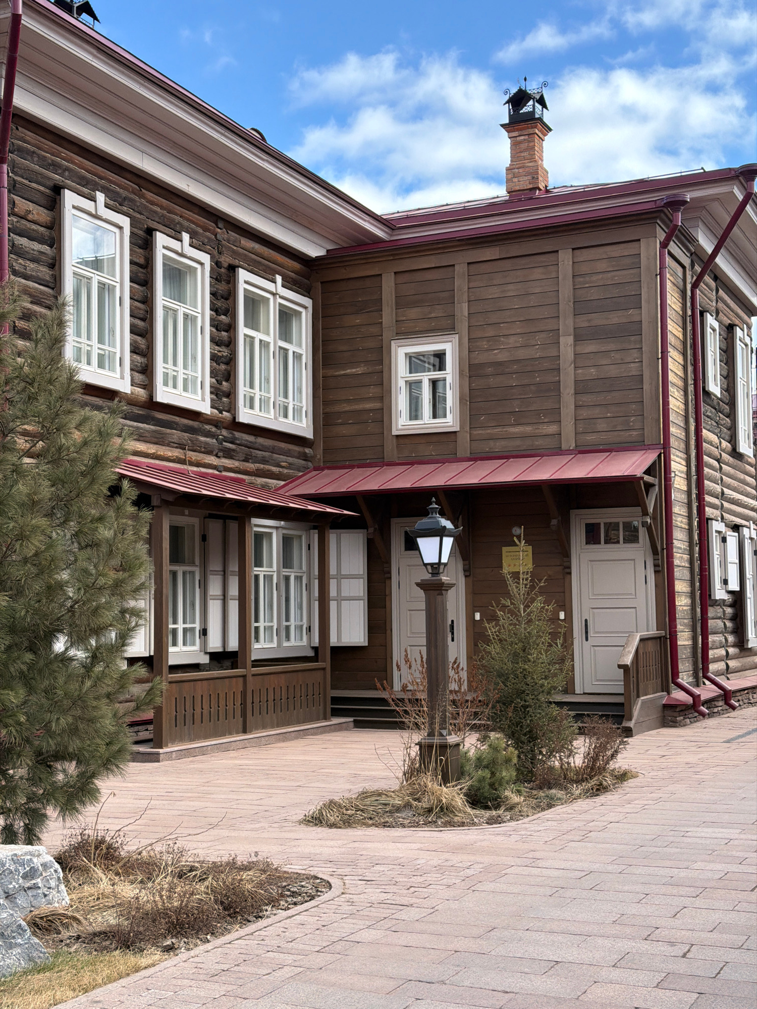 The image displays the exterior of a multi-story wooden building located in Krasnoyarsk, Russia, under a bright blue sky with scattered white clouds. No people or specific activities are visible, pres…read more