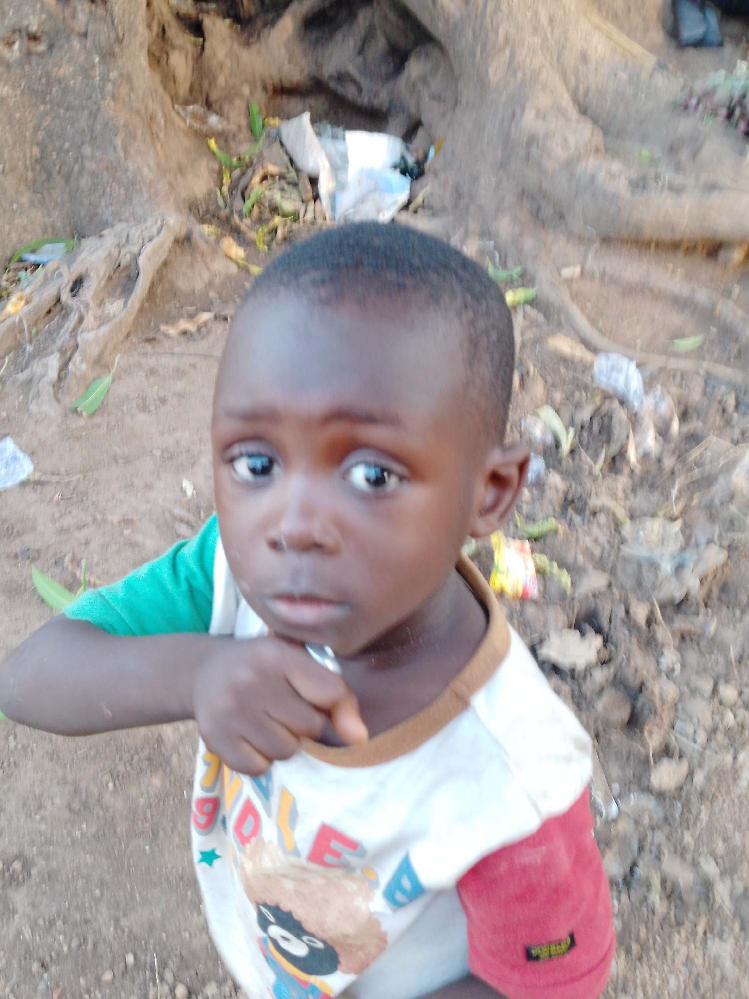 A young child with dark skin and short hair stands in front of a large tree root system on bare earth. The child is wearing a T-shirt with green, red, and white portions. The child's expression is sol…read more