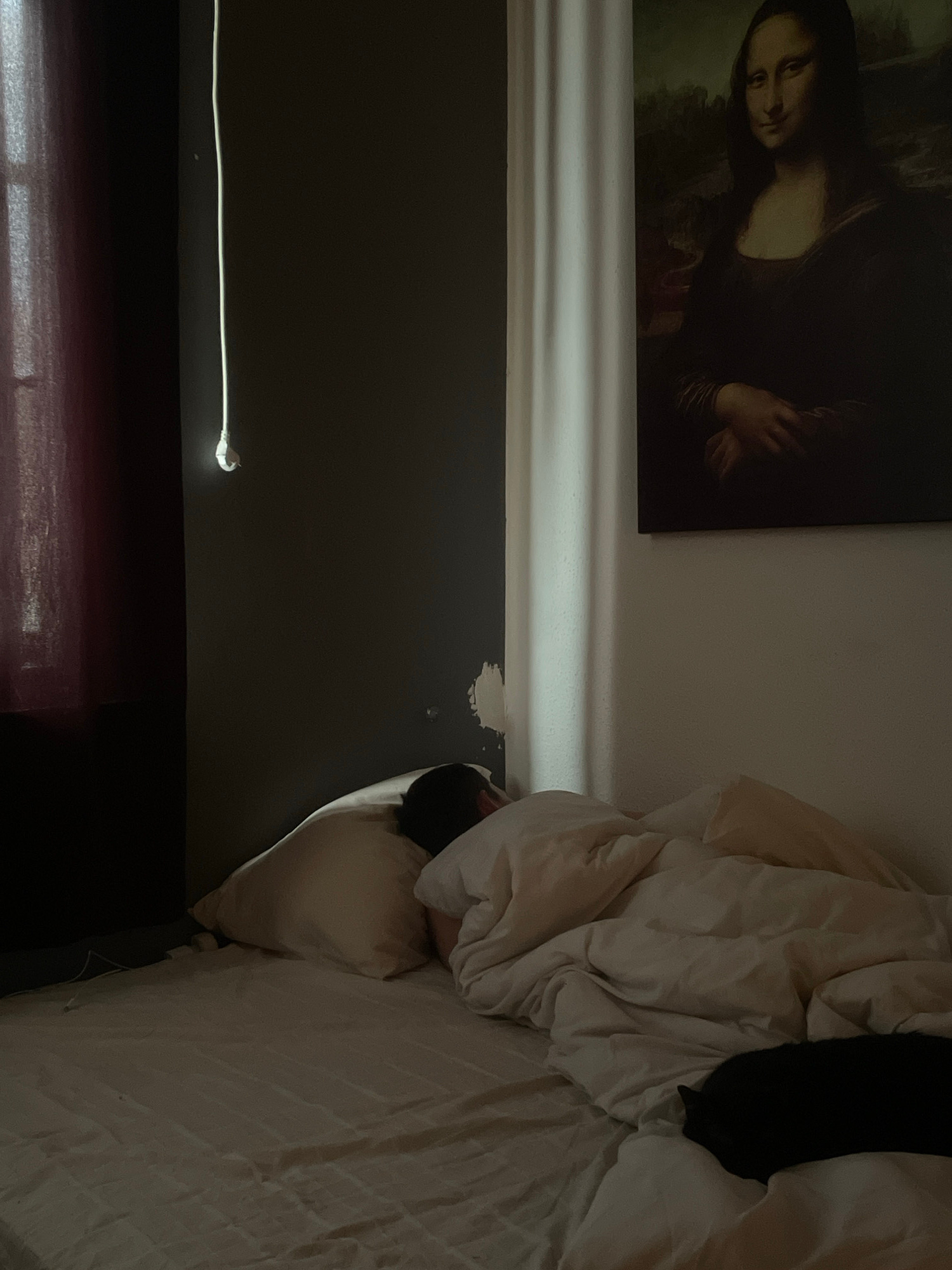 The image depicts a dimly lit bedroom interior. A painting of the Mona Lisa hangs on the wall above a white molding. Below the molding, the wall is painted a dark gray. A white cable with a bulb is vi…read more