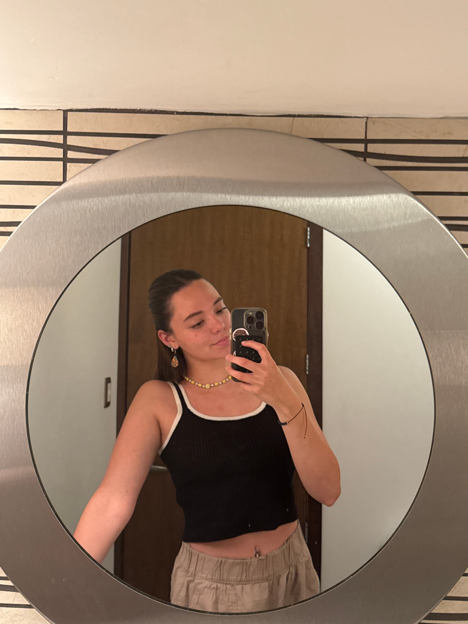 A person is taking a selfie in a circular mirror in a bathroom. The person is wearing a black tank top with white trim and tan pants. They are holding a phone in their right hand. The background inclu…read more