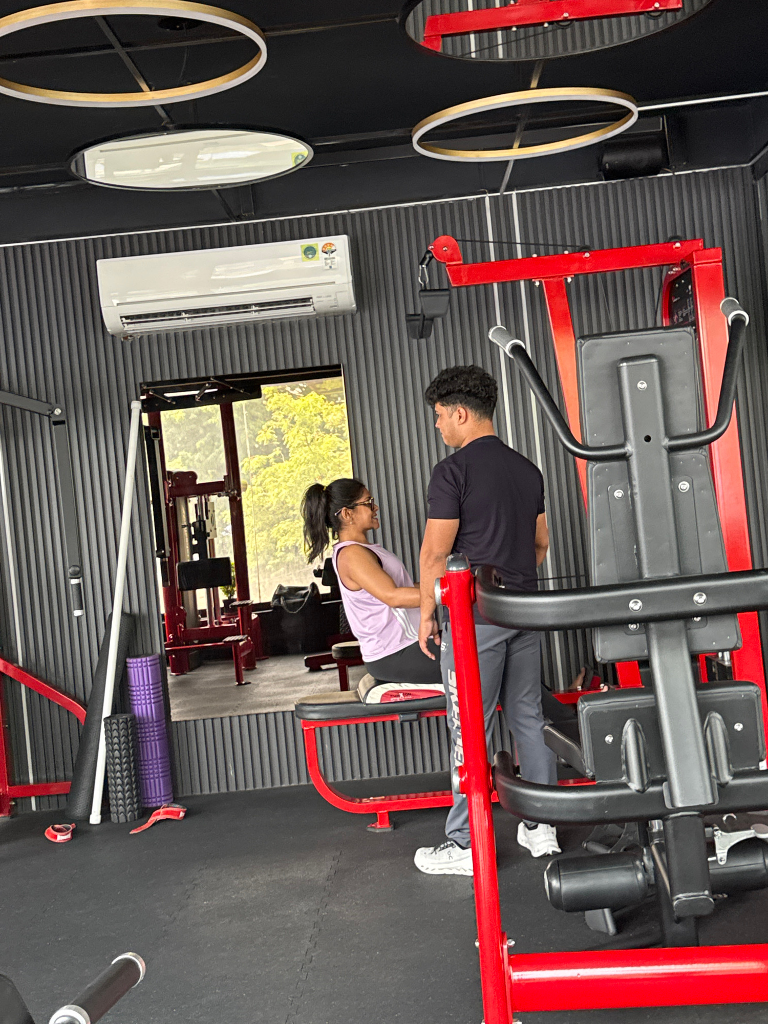 The scene depicts a gym setting, likely in Kolkata, India, featuring two individuals using a red, heavy-duty leg press machine. One person, wearing a black shirt and grey pants, is currently in a seat…read more
