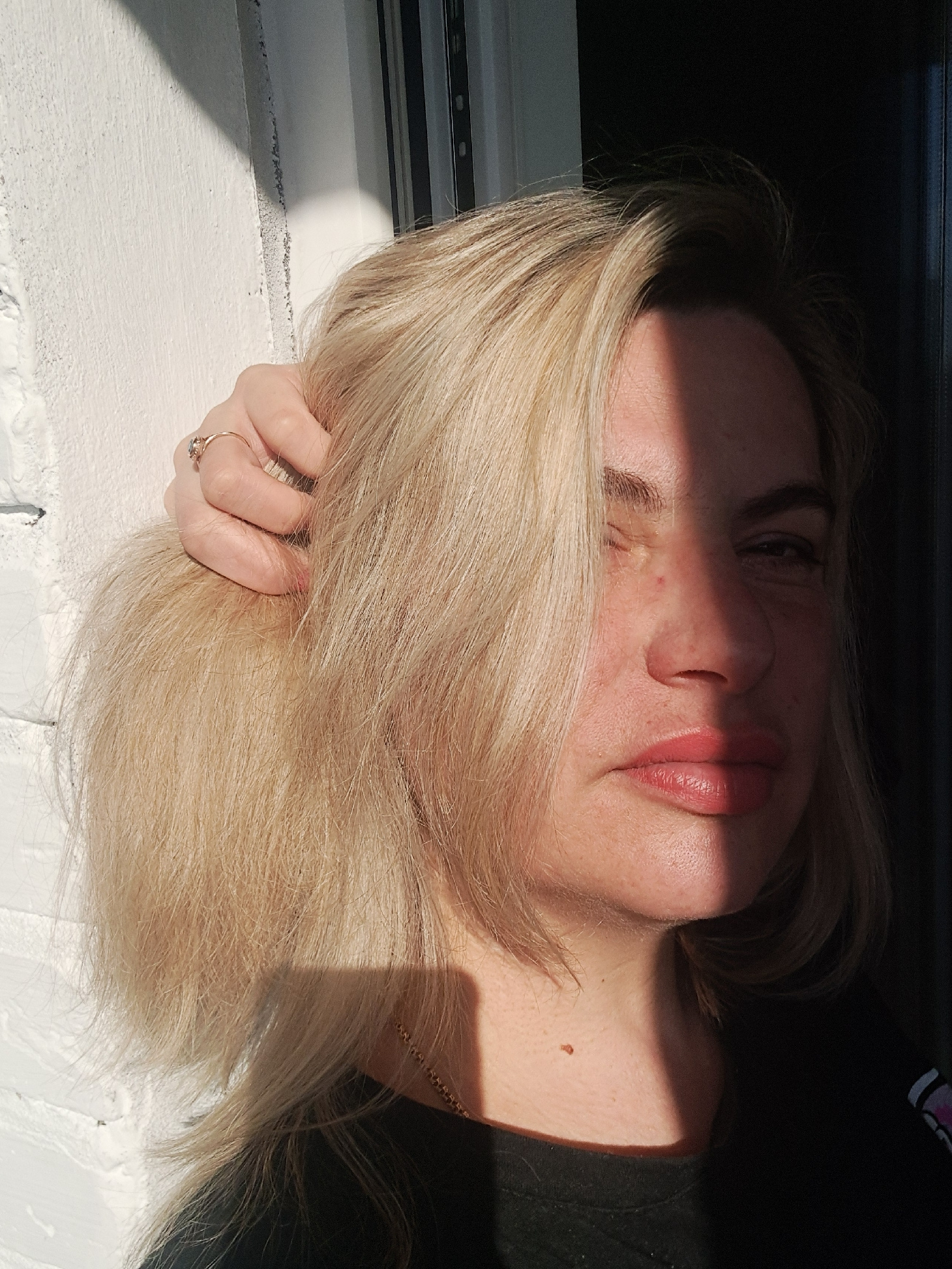 A fair-skinned person with blonde hair is resting their face on a white windowsill. The person is wearing a black shirt, and a gold chain is visible on their neck. Part of their face is illuminated by…read more