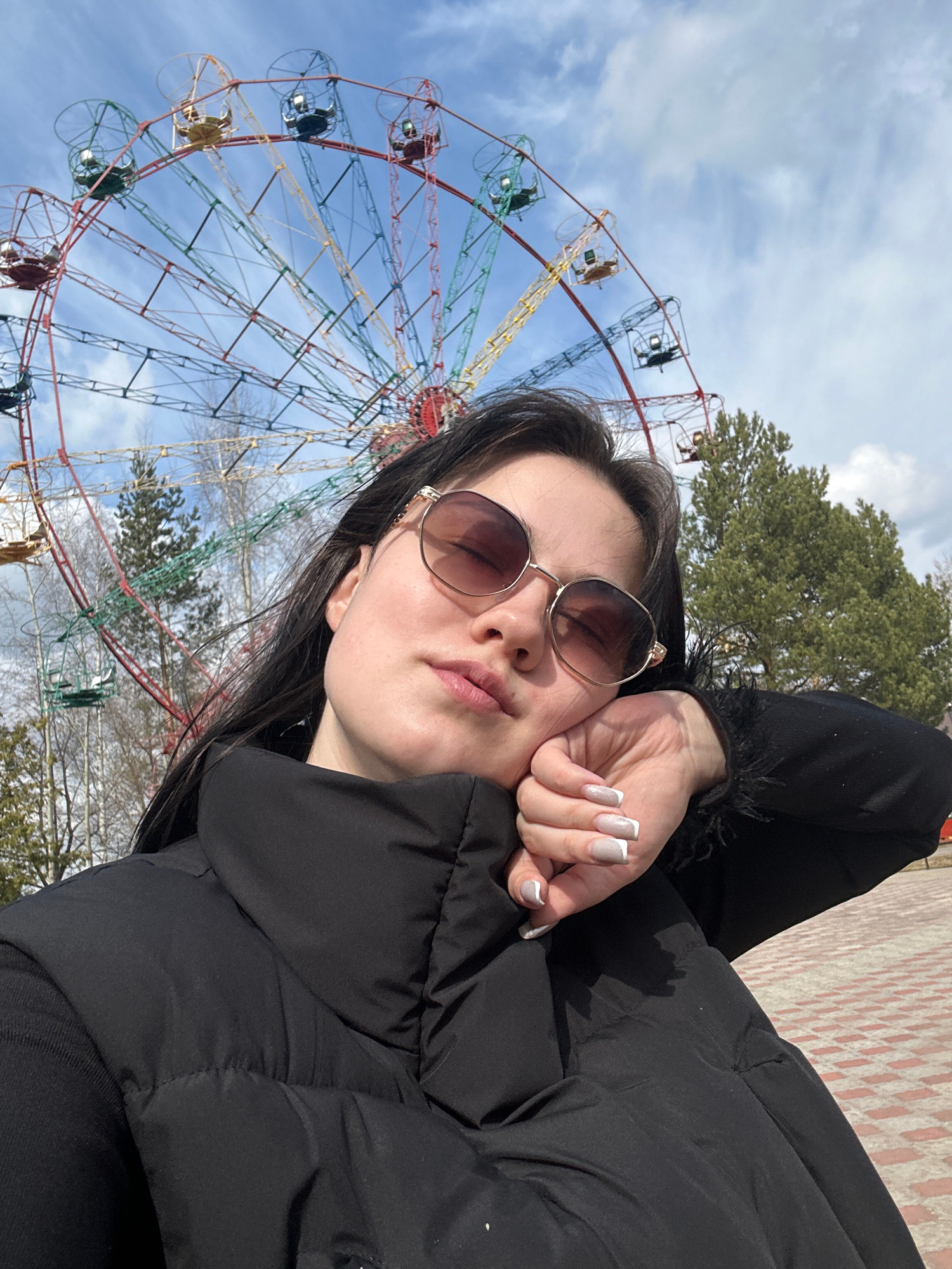A rotated selfie captures a young woman outdoors in Chaikovsky, Russia, against the backdrop of a large Ferris wheel. The woman, shown from the chest up, has long dark hair and wears dark, round sungl…read more